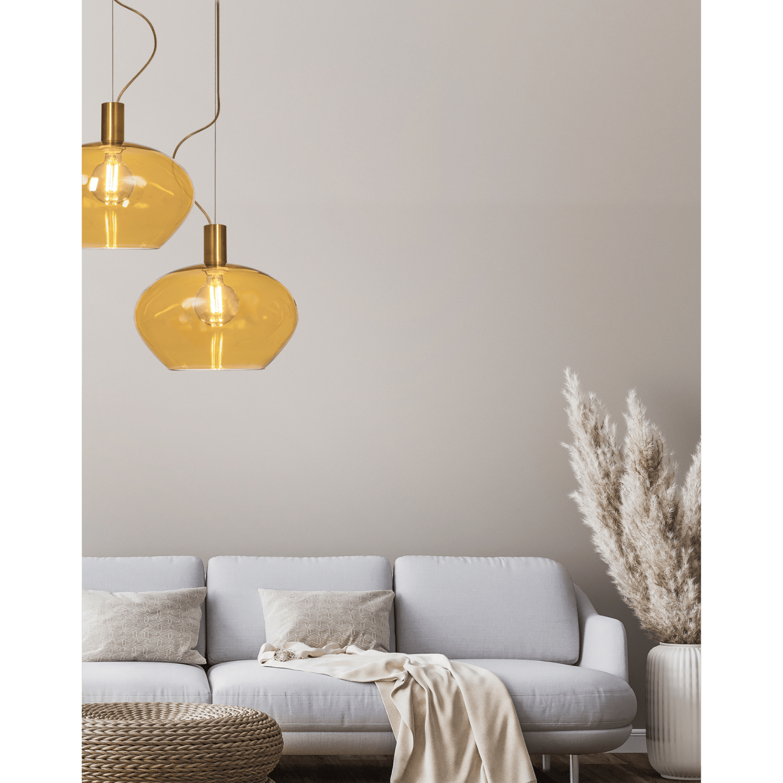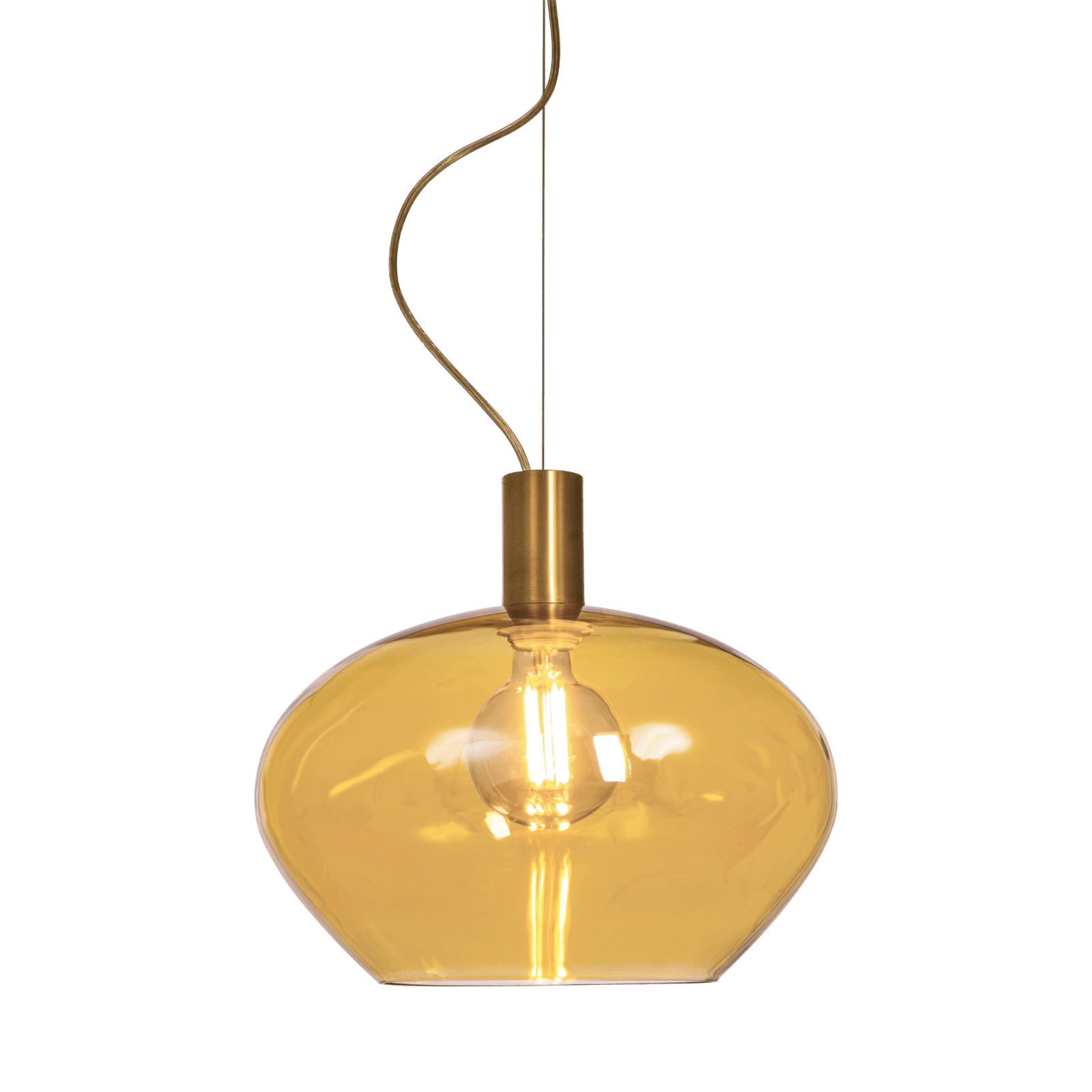 Bell taklampa i matt mässing med amberfärgat glas. Takkoppen i metall för krokupphäng med kopplingsplint, lamppropp kan monteras. Max 40W E27, ingår ej.