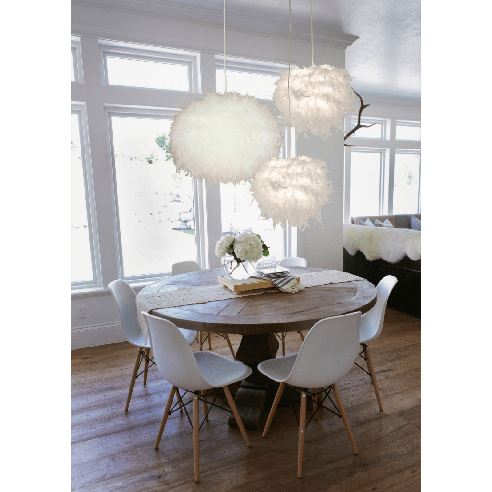 Boa taklampa med vita fjädrar från gås. Lampan kan justeras till önskad höjd med en 130 cm lång sladd. Takkopp i plast för krokupphäng och med kopplingsplint. Vi rekommenderar ljuskälla med matt glas för bästa ljus utan skuggor i skärmen eller omgivningen. Denna lampa passar till exempel över sängen i barnrummet.