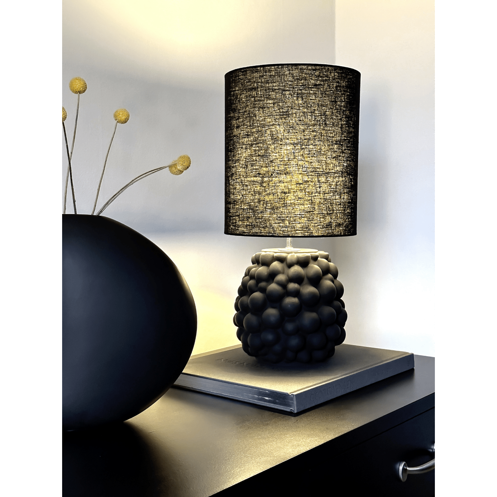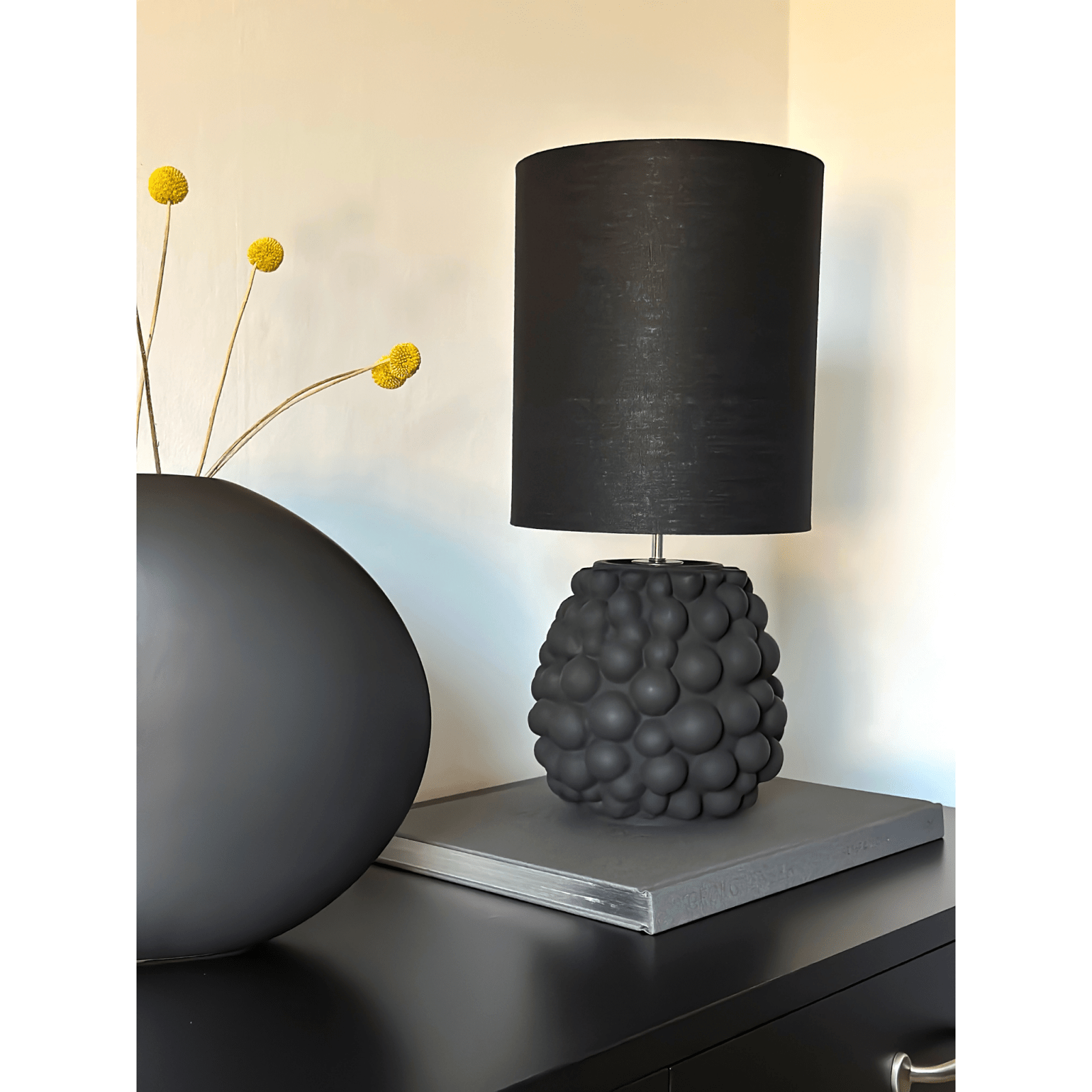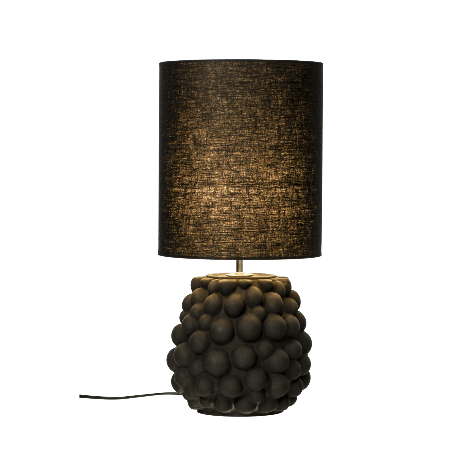 Spännande Bubbles bordslampa har en unik lampfot av glas med textur av olikformade bubblor. Med en textilskärm som ger ett mjukt och behagligt ljus. Bubbles passar in de flesta rum och blir både en vacker och funktionell del av inredningen.