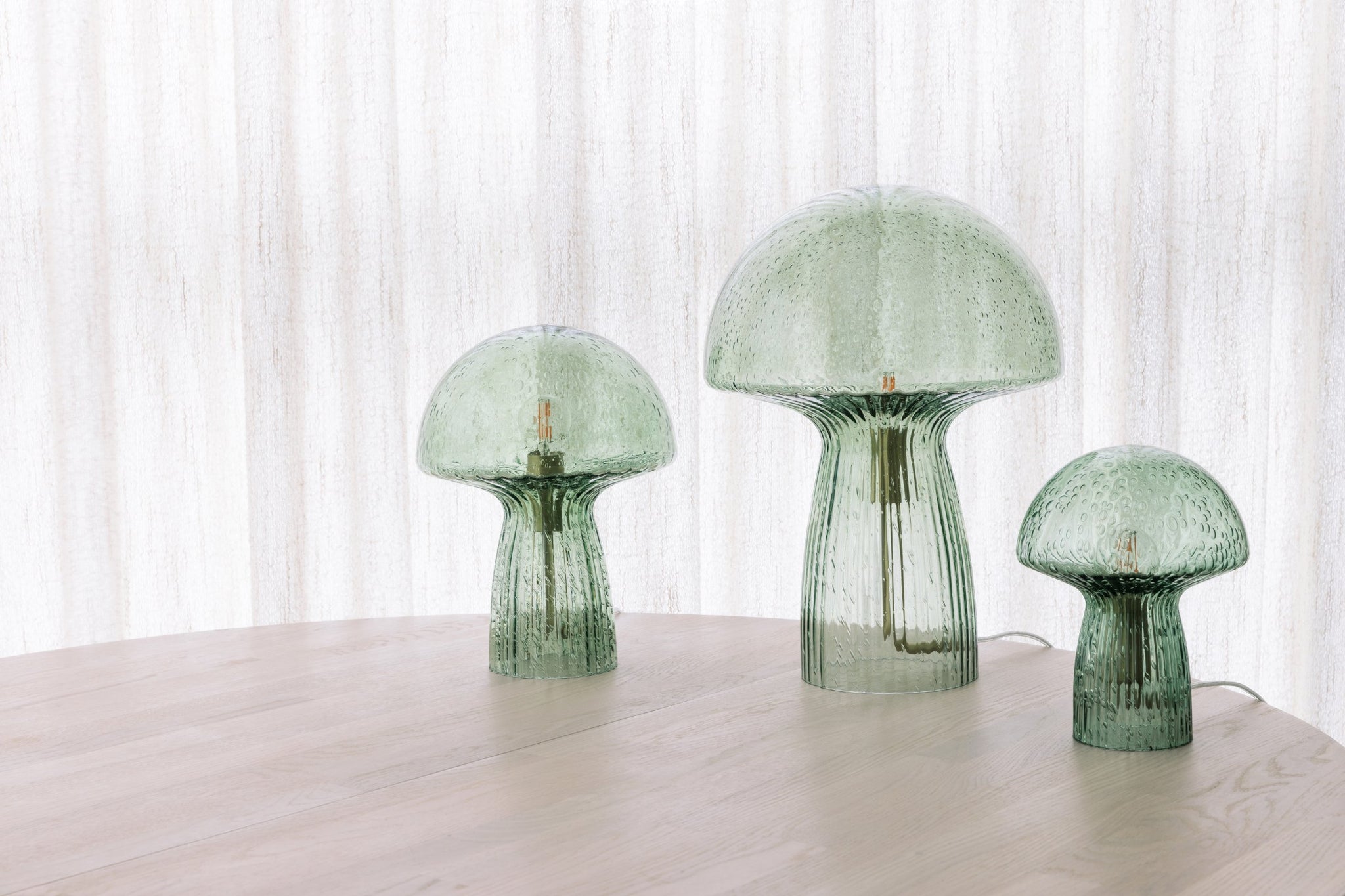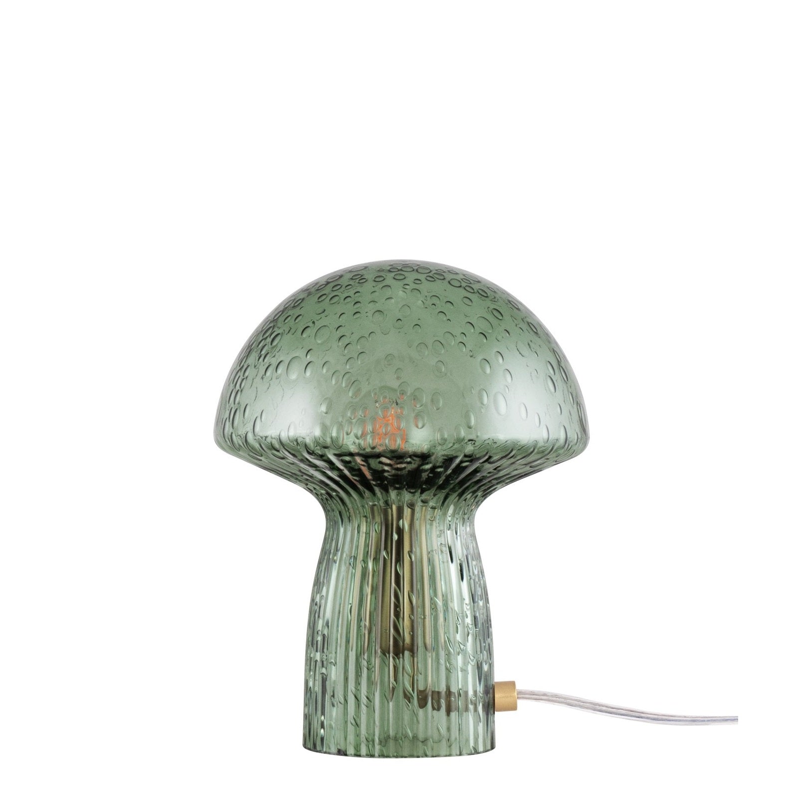 Med inspiration från skogen kommer denna nätta bordslampa avbildad som en svamp. Den är gjord i grönt glas med räfflade detaljer på foten där räfflorna går hela vägen upp under hatten likt lamellerna på en skivlingsvamp. Lampan har dessutom små vackra luftbubblor i glaset som ger en fin karaktär när lampan är tänd. Fungo har en 200 cm lång transparent kabel med transparent brytare och stickkontakt. Varje lampa är munblåst och unik, vilket innebär att variationer i färg, glastjocklek och antal bubblor kan förekomma.