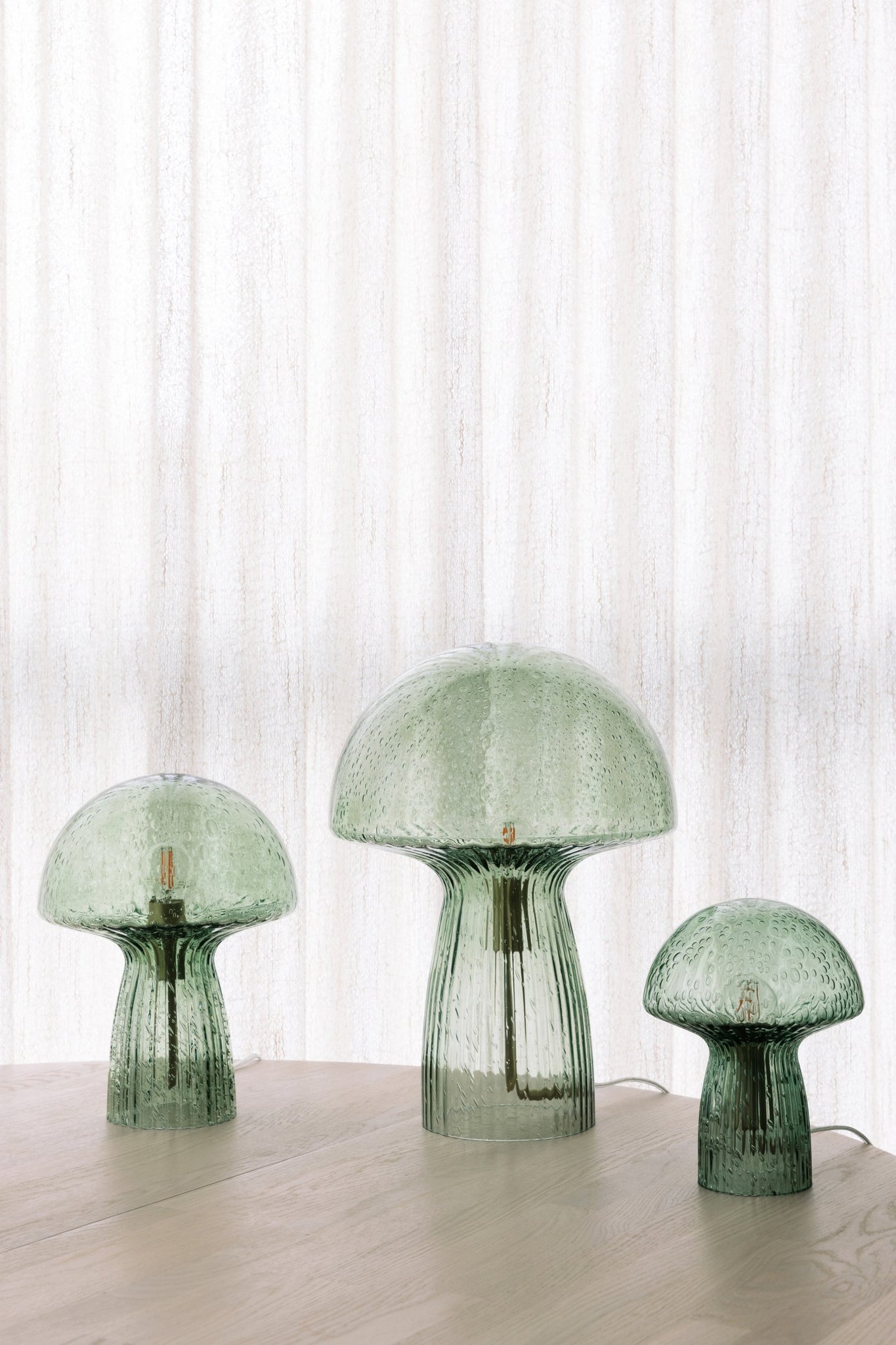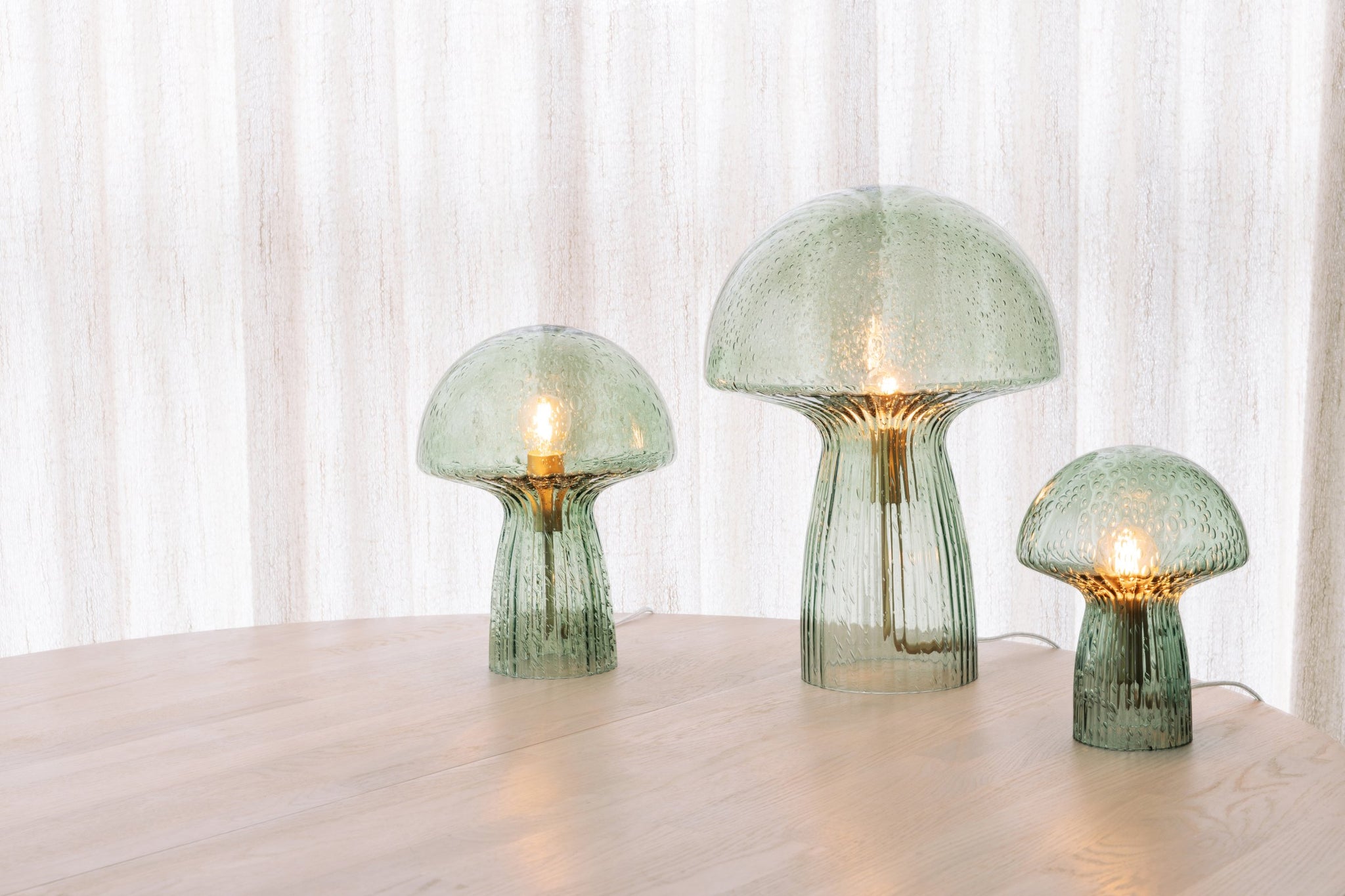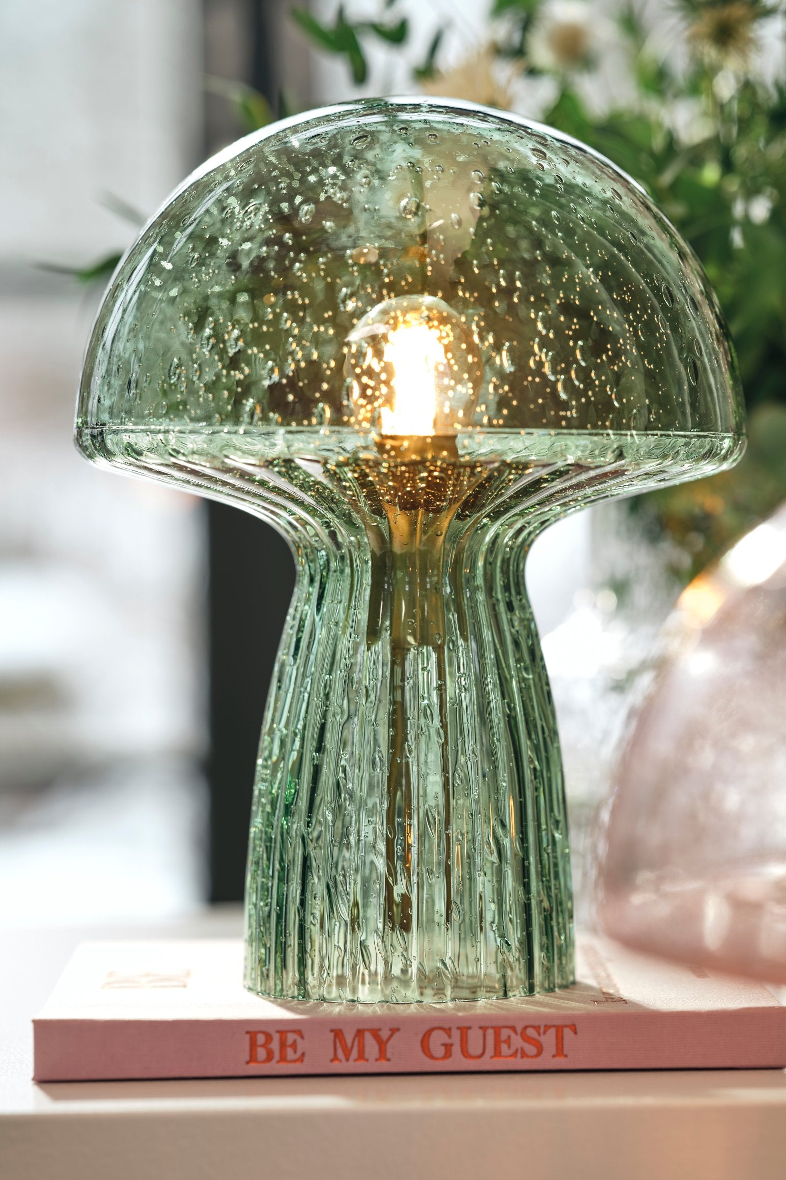 Med inspiration från skogen kommer denna nätta bordslampa avbildad som en svamp. Den är gjord av dovt grönt färgat glas med räfflade detaljer på foten där räfflorna går hela vägen upp under hatten likt lamellerna på en skivlingsvamp. Lampan har dessutom små vackra luftbubblor i glaset som ger en fin karaktär när lampan är tänd. Fungo Special Edition 22 är en mellanstor bordslampa som gör sig fint i ett fönster, på ett sideboard eller i en hylla. Fungo har en lamphållare i kontrasterande borstad mässingsfärgad metall samt en 200 cm lång transparent kabel med transparent brytare och stickkontakt.