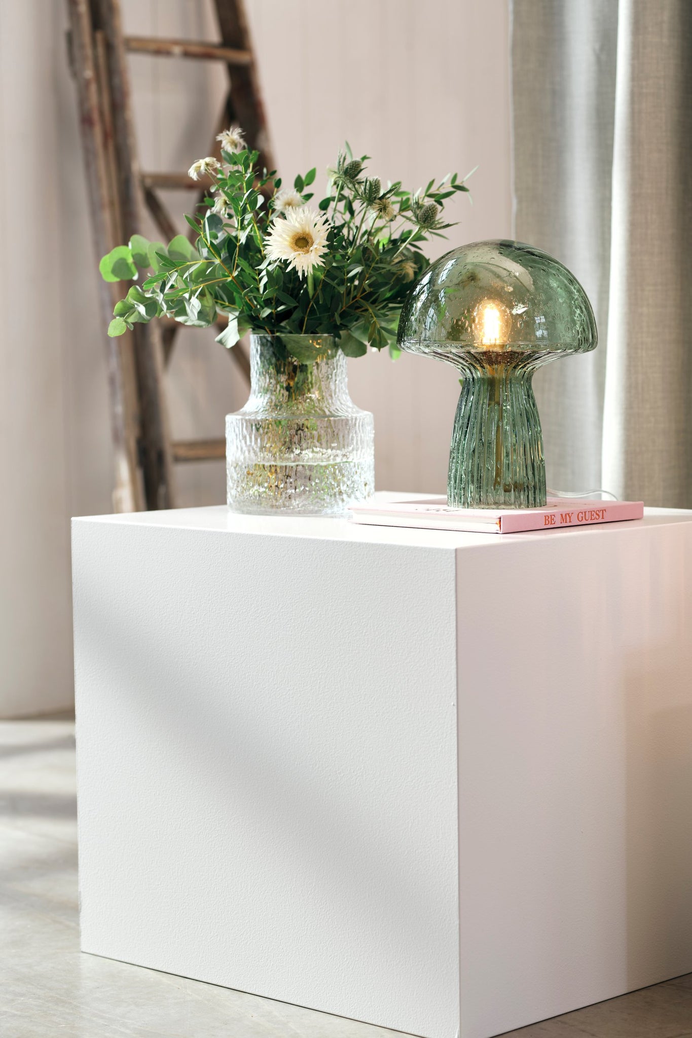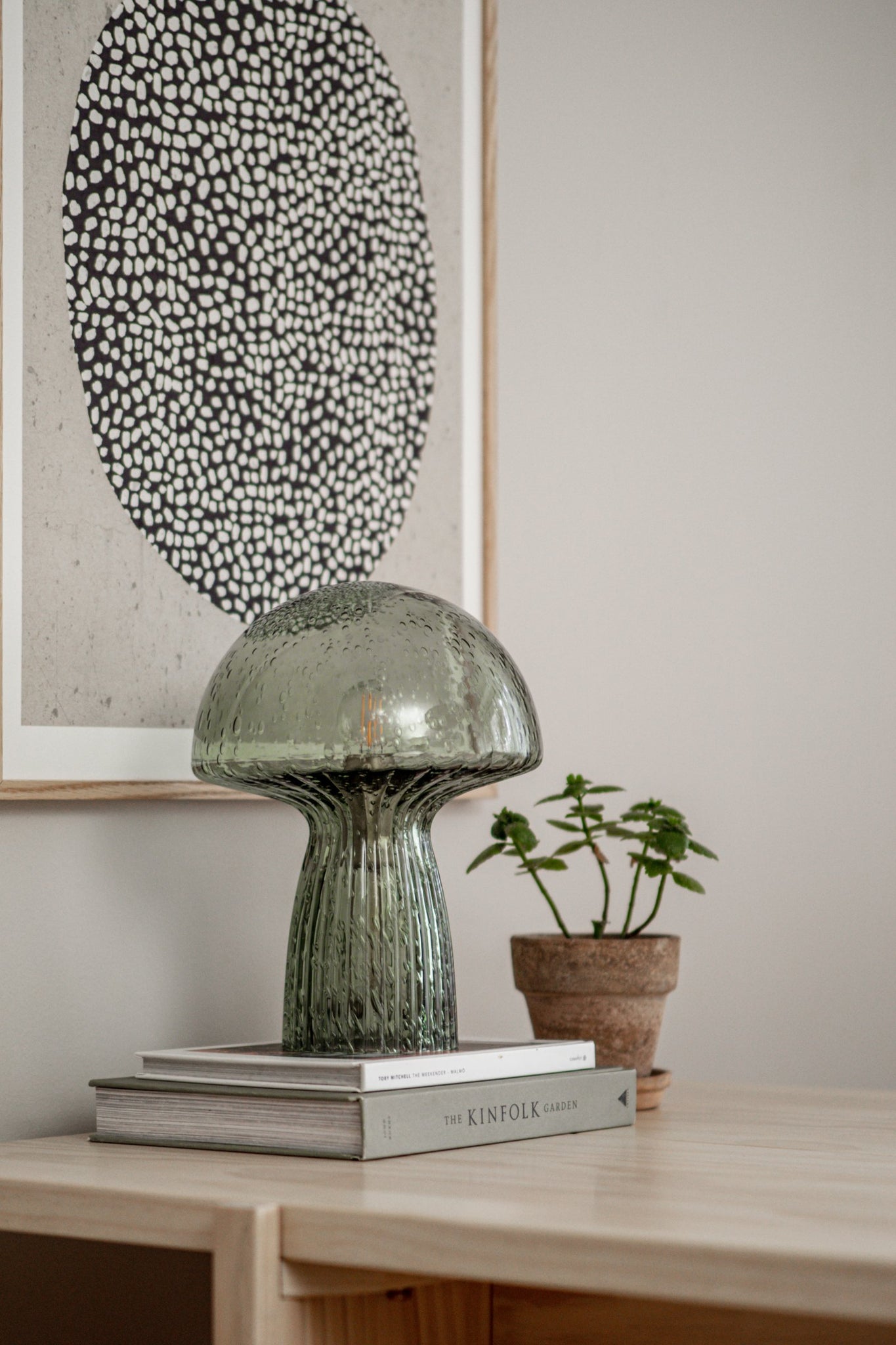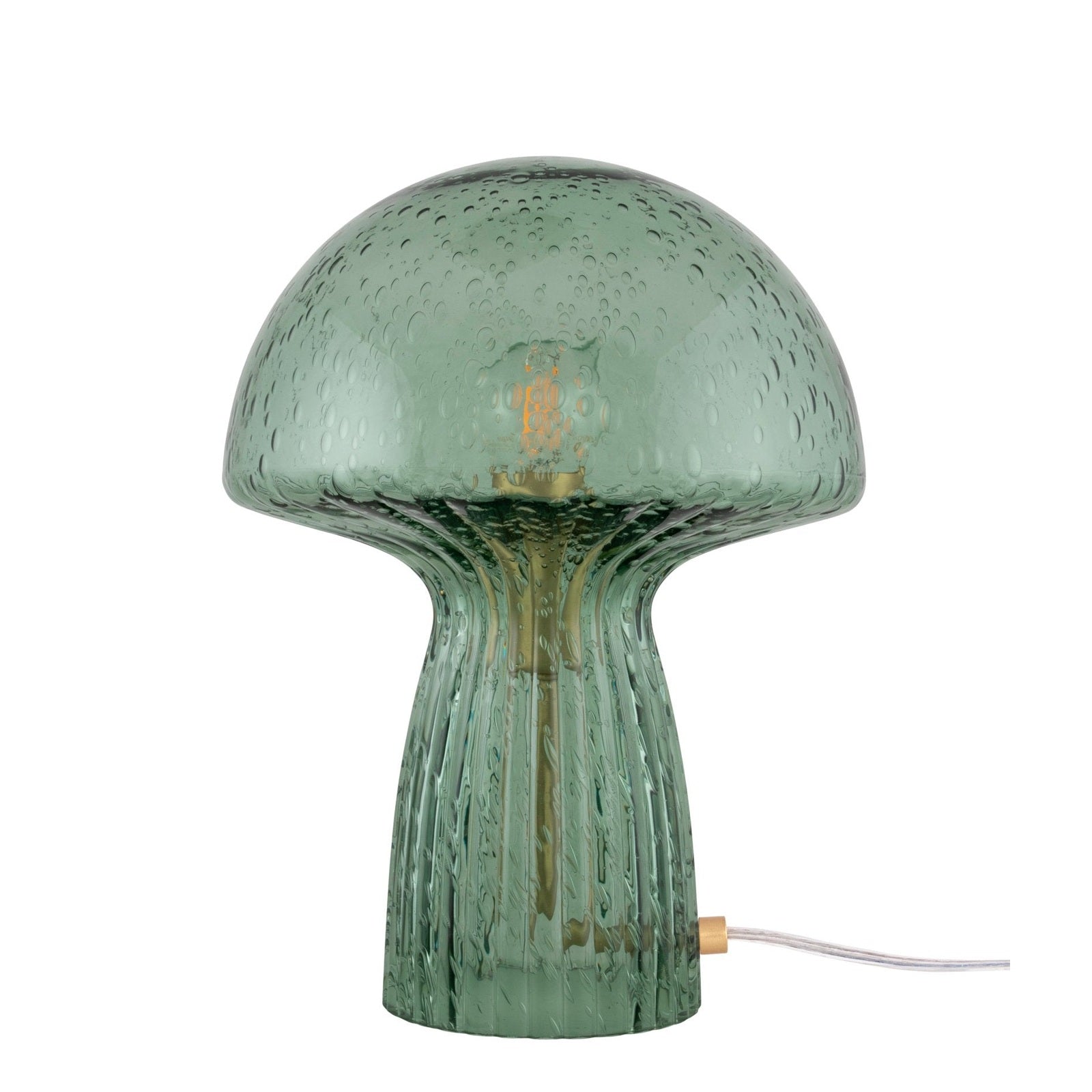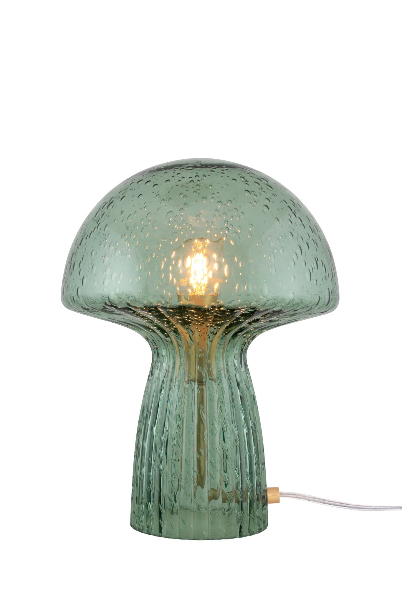 Med inspiration från skogen kommer denna nätta bordslampa avbildad som en svamp. Den är gjord av dovt grönt färgat glas med räfflade detaljer på foten där räfflorna går hela vägen upp under hatten likt lamellerna på en skivlingsvamp. Lampan har dessutom små vackra luftbubblor i glaset som ger en fin karaktär när lampan är tänd. Fungo Special Edition 22 är en mellanstor bordslampa som gör sig fint i ett fönster, på ett sideboard eller i en hylla. Fungo har en lamphållare i kontrasterande borstad mässingsfärgad metall samt en 200 cm lång transparent kabel med transparent brytare och stickkontakt.