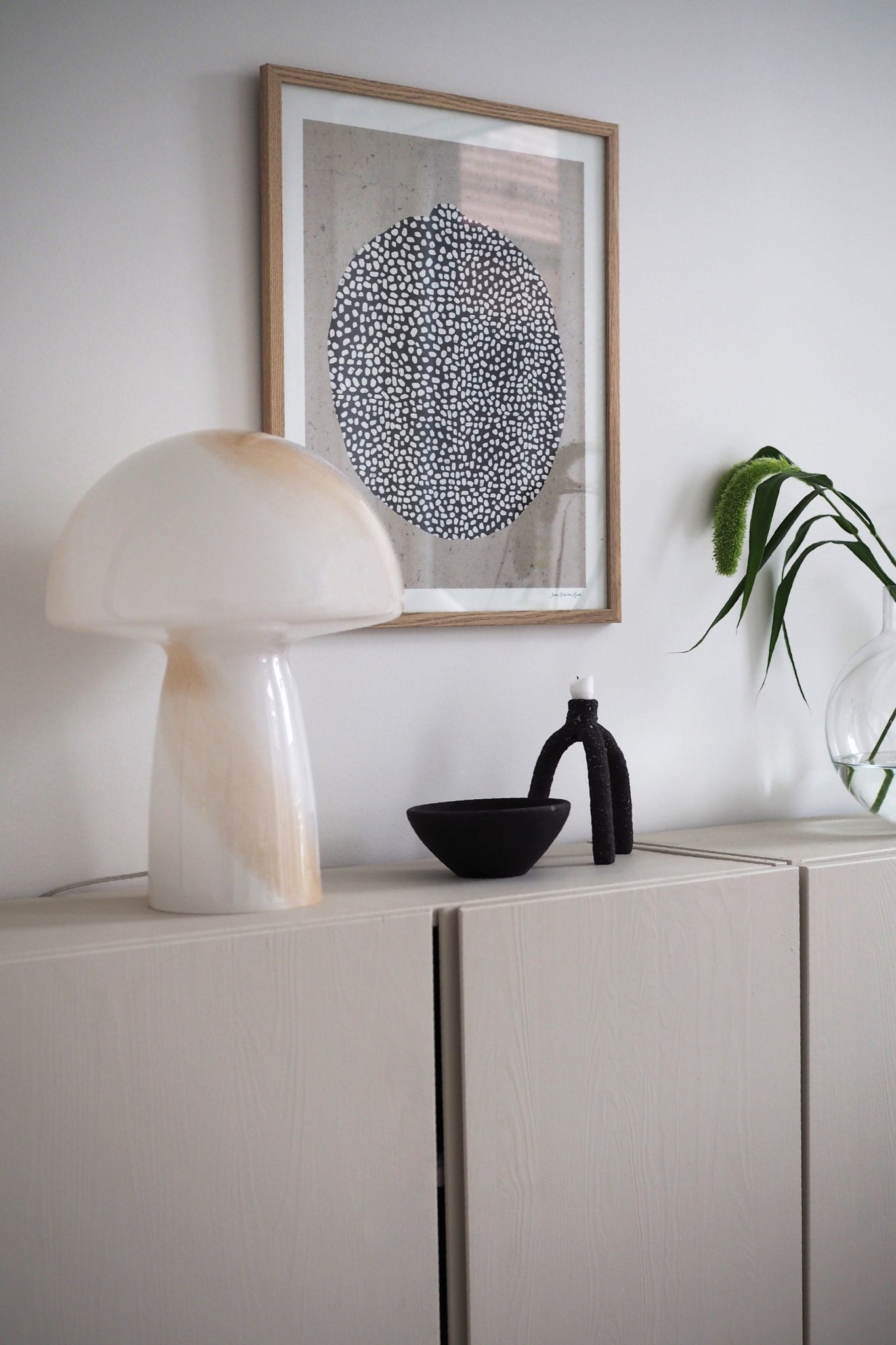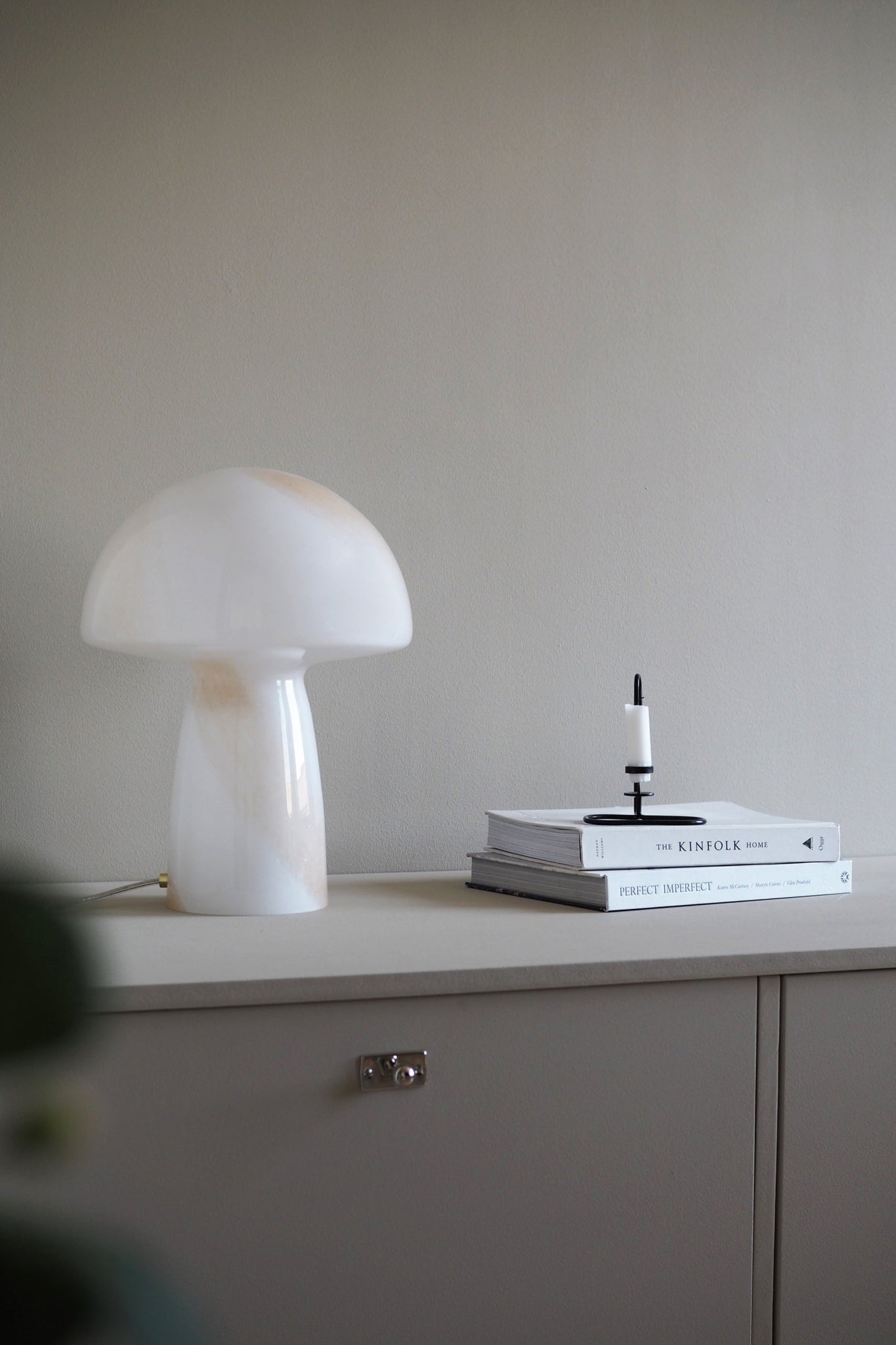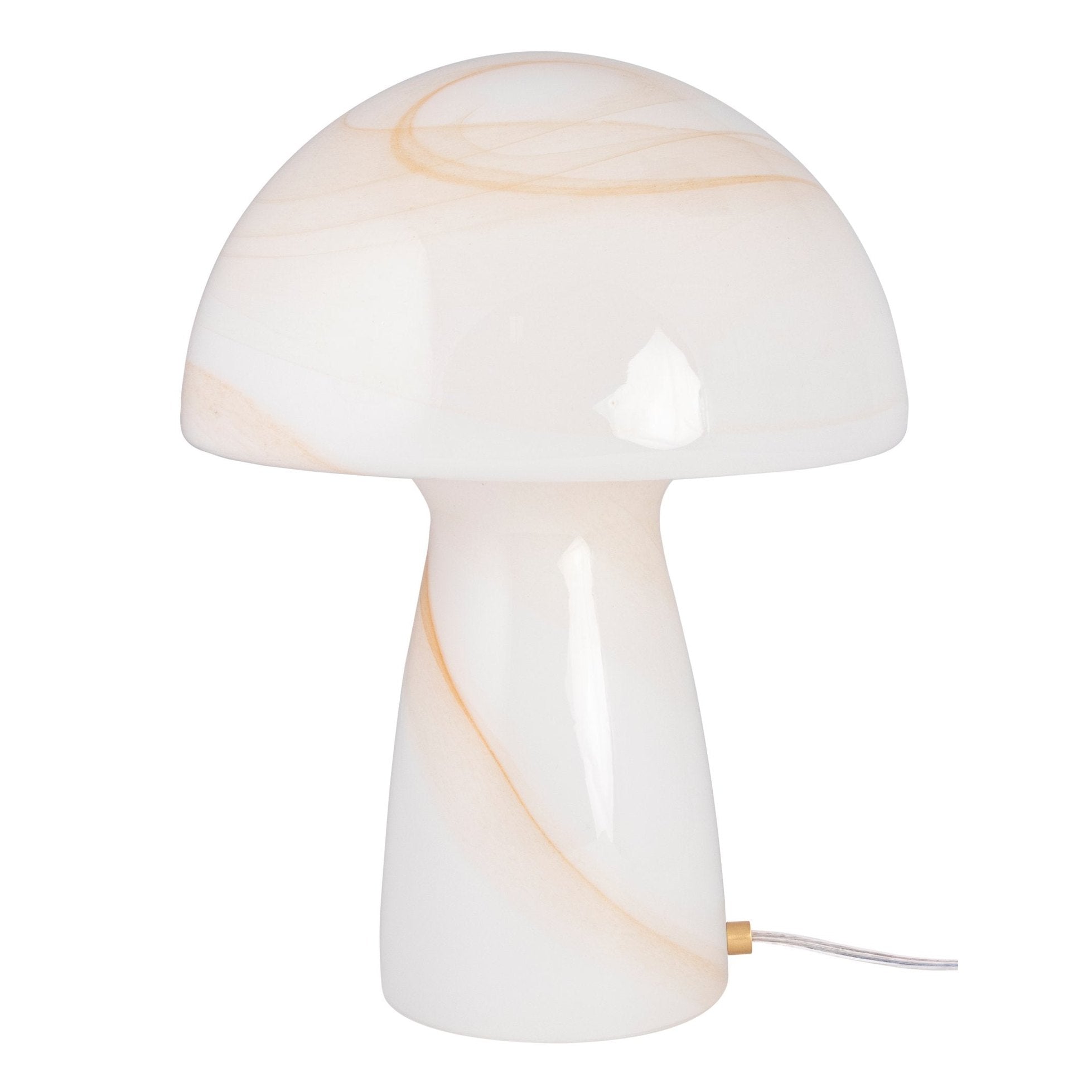 Med inspiration från skogen kommer denna större bordslampa avbildad som en svamp. Den är gjord i vitt glas med ett oregelbundet ljusbrunt mönster. Glaset släpper igenom ett behagligt soft ljus och denna lite större lampa gör sig fint i ett djupare fönster eller på ett sideboard. Fungo har en lamphållare i mässingsfärgad metall samt en 200 cm lång transparent kabel med transparent brytare och stickkontakt. Obs! Denna artikel är handgjord vilket bidrar till att varje lampa är unik. Mönster och färgmängd kan variera och skilja sig från bilderna.