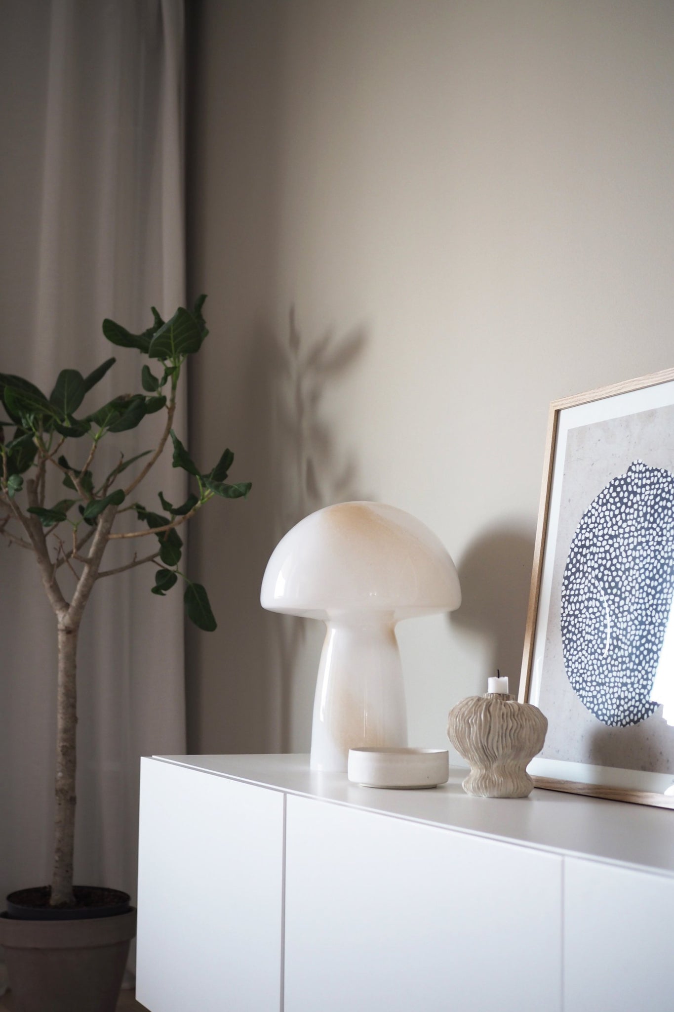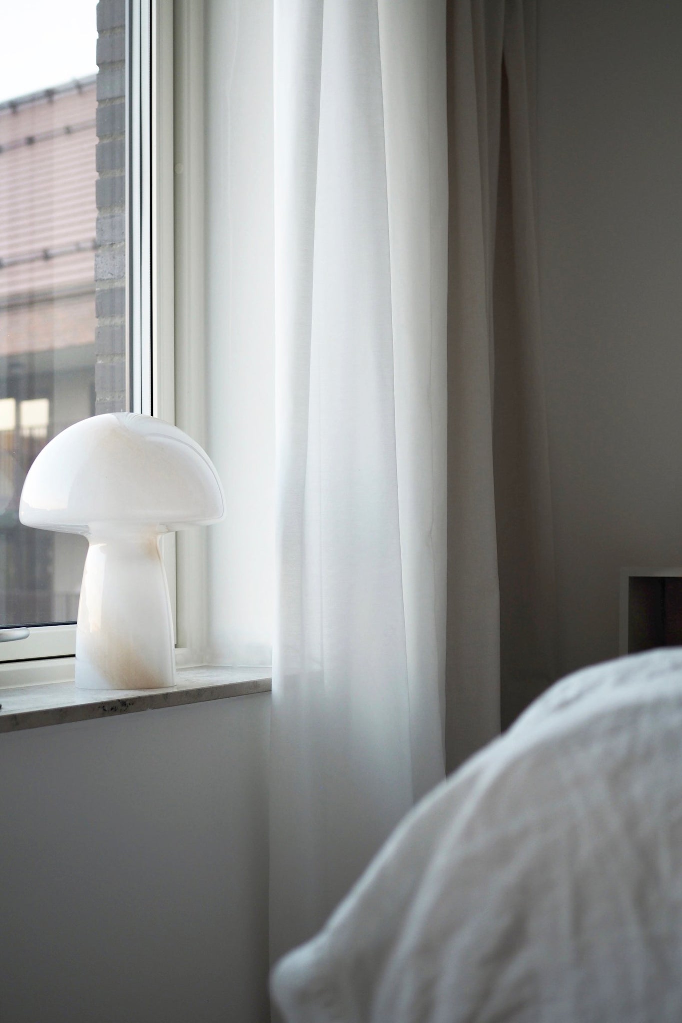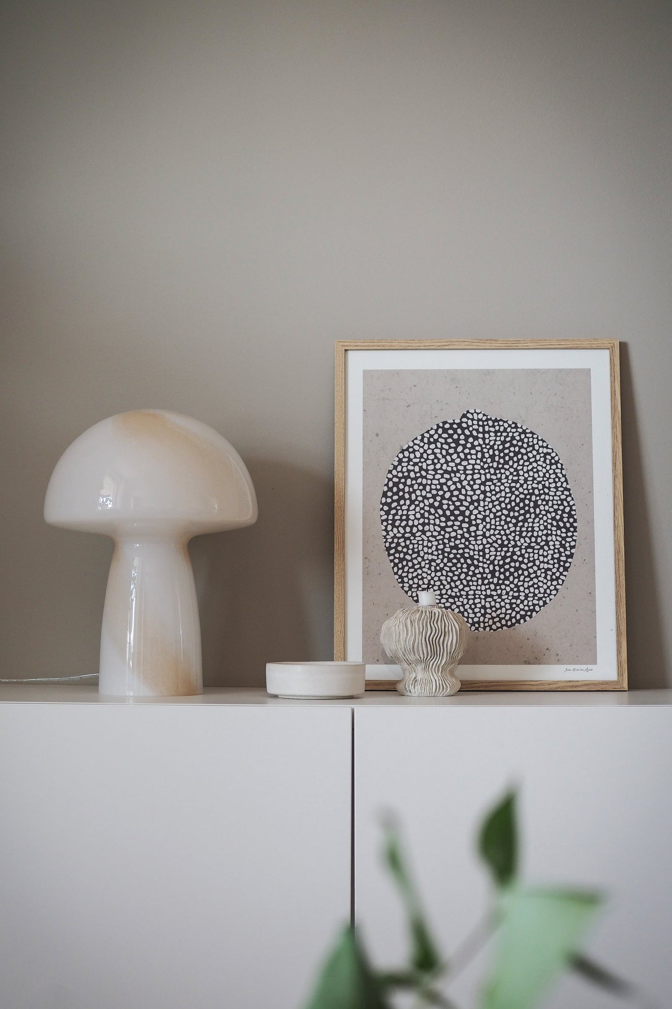 Med inspiration från skogen kommer denna större bordslampa avbildad som en svamp. Den är gjord i vitt glas med ett oregelbundet ljusbrunt mönster. Glaset släpper igenom ett behagligt soft ljus och denna lite större lampa gör sig fint i ett djupare fönster eller på ett sideboard. Fungo har en lamphållare i mässingsfärgad metall samt en 200 cm lång transparent kabel med transparent brytare och stickkontakt. Obs! Denna artikel är handgjord vilket bidrar till att varje lampa är unik. Mönster och färgmängd kan variera och skilja sig från bilderna.