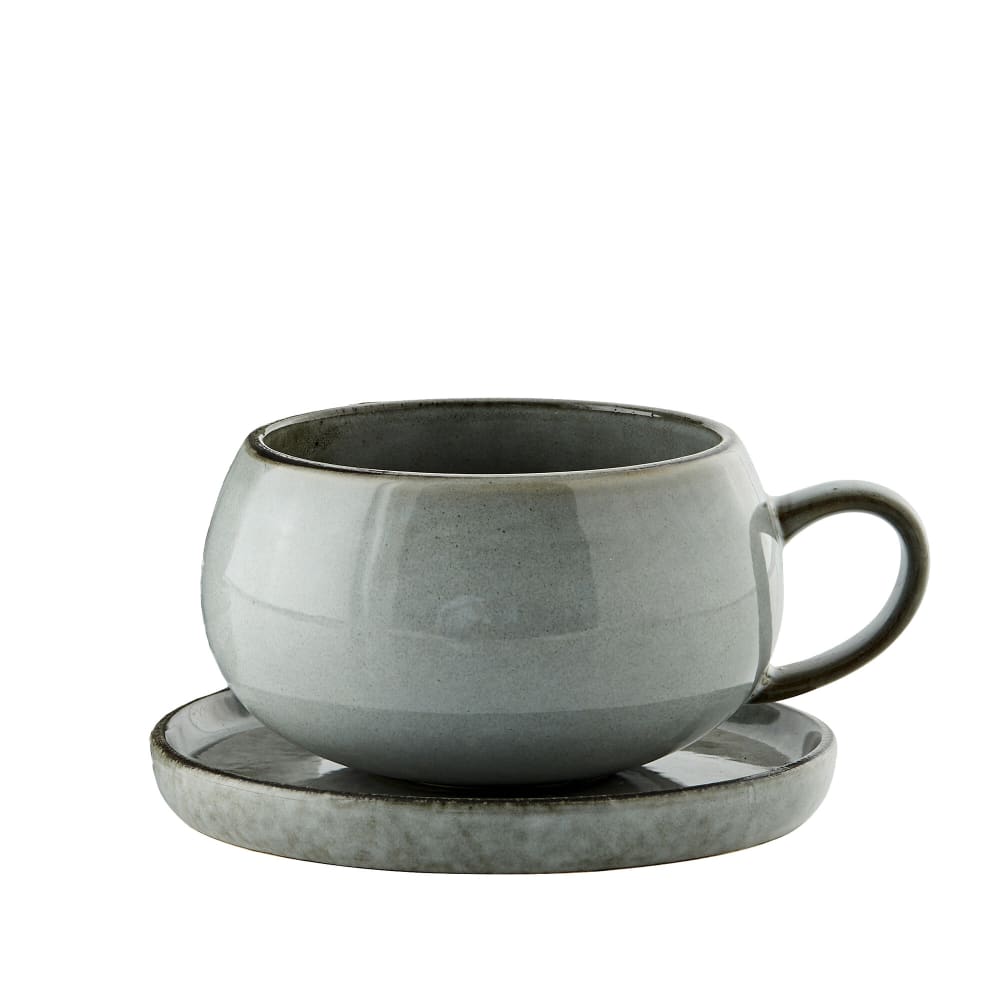 Uppgradera matbordet med LENE BJERRE's vackra Amera kopp och fat i grå stengods. Med dess lugna färgtoner och mjuka organiska former skapar detta 40 cl-set en härlig atmosfär. Ingår i Amera-serien, alla produkterna i serien har en unik, handgjord design med dubbel reaktiv glasyr. Ett perfekt tillskott för en avslappnad och stilren inredning i köket eller vardagsrummet.