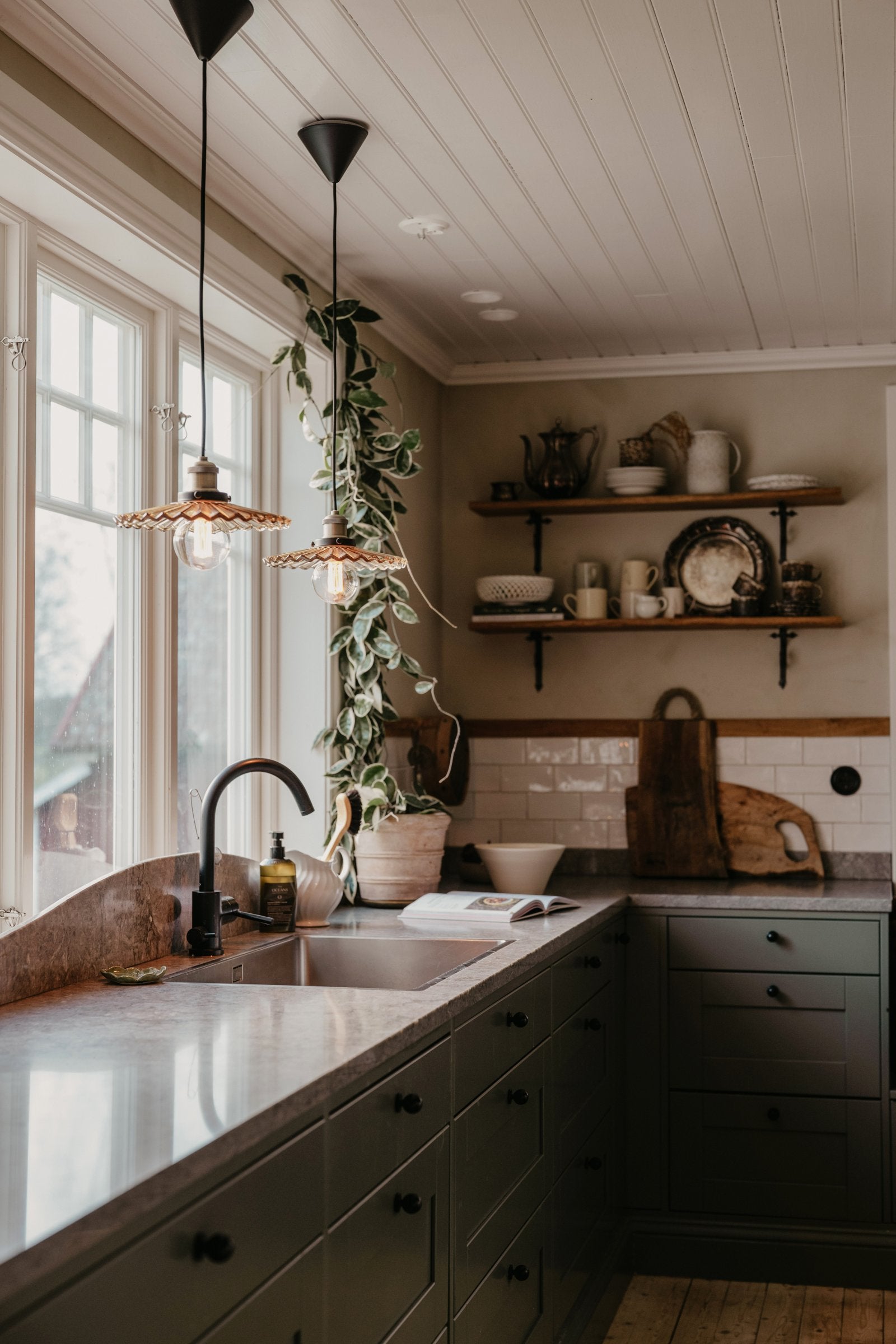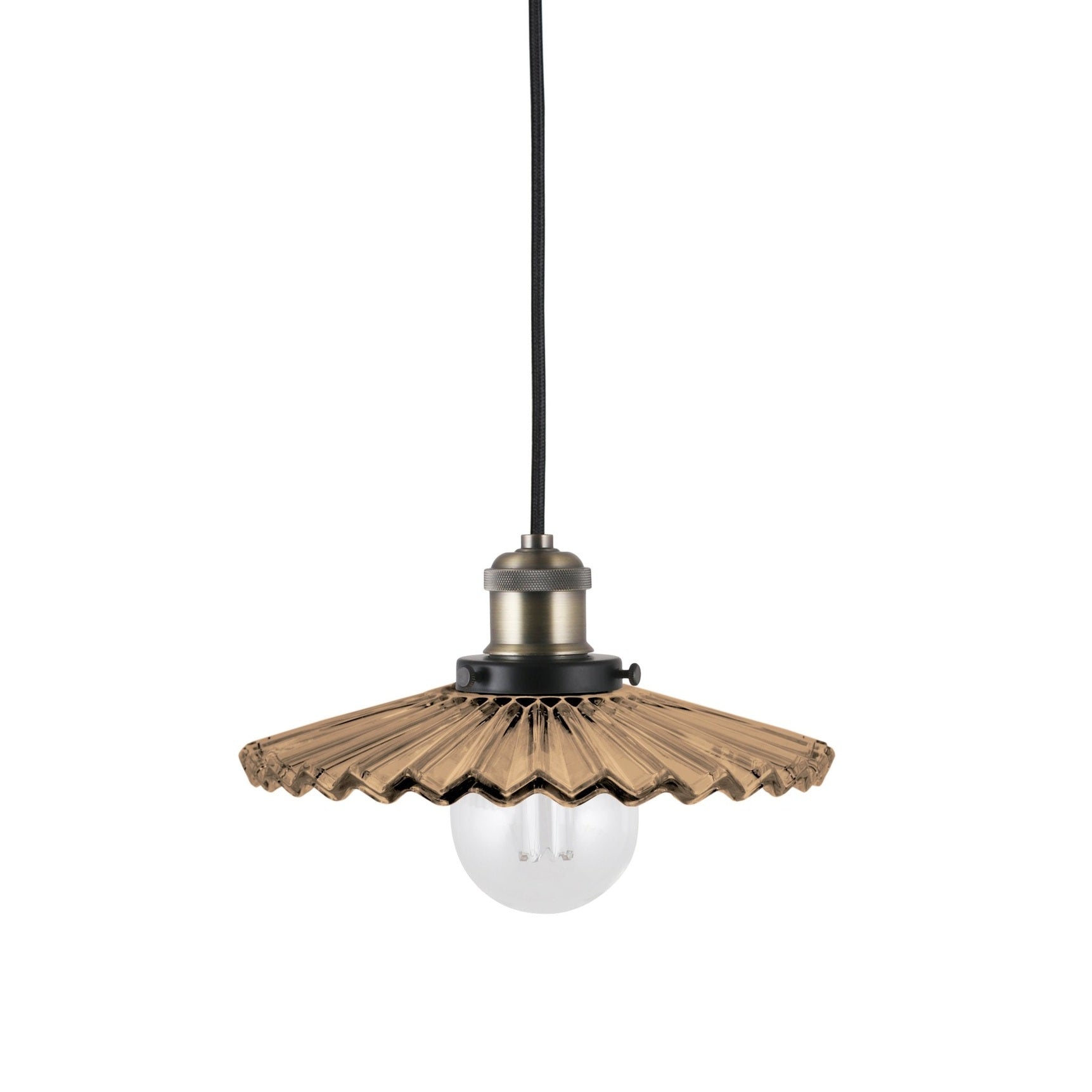 Cobbler är en ny tappning på en klassisk skomakarlampa som gör sig perfekt i flera olika inredningar. I det modernt lantliga- eller sekelskifteshemmet, men också i den franska bistroinredningen. Lampan har en skärm av veckat glas i en tidlös brun nyans som ger en vacker ljusspridning i det räfflade glaset. Glasskärmen matchas med detaljer i mattsvart- och antikmässingsfärgad metall. Lampan har en 120 cm lång svart textilkabel samt en takkopp i svart plast. Kronkoppling för takanslutning medföljer ej.