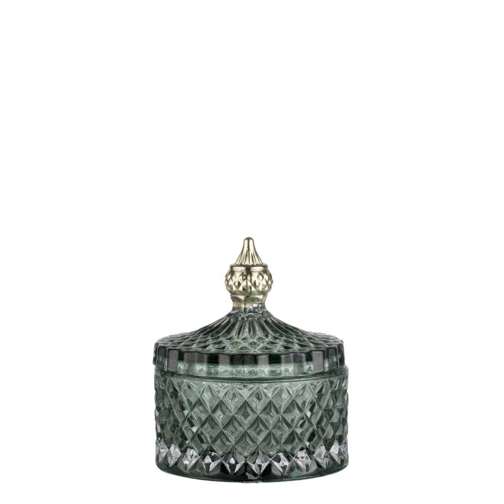 Med LENE BJERRE Miya Glasburk H10,5 cm i grön och guld kan du förvara smycken eller andra små prylar på ett konstnärligt sätt. Den eleganta glasburken passar perfekt för att skapa en personlig och stilig atmosfär i ditt hem, oavsett om det är på din byrå eller i badrummet. En unik inredningsdetalj med vacker glasdesign som passar i alla rum.