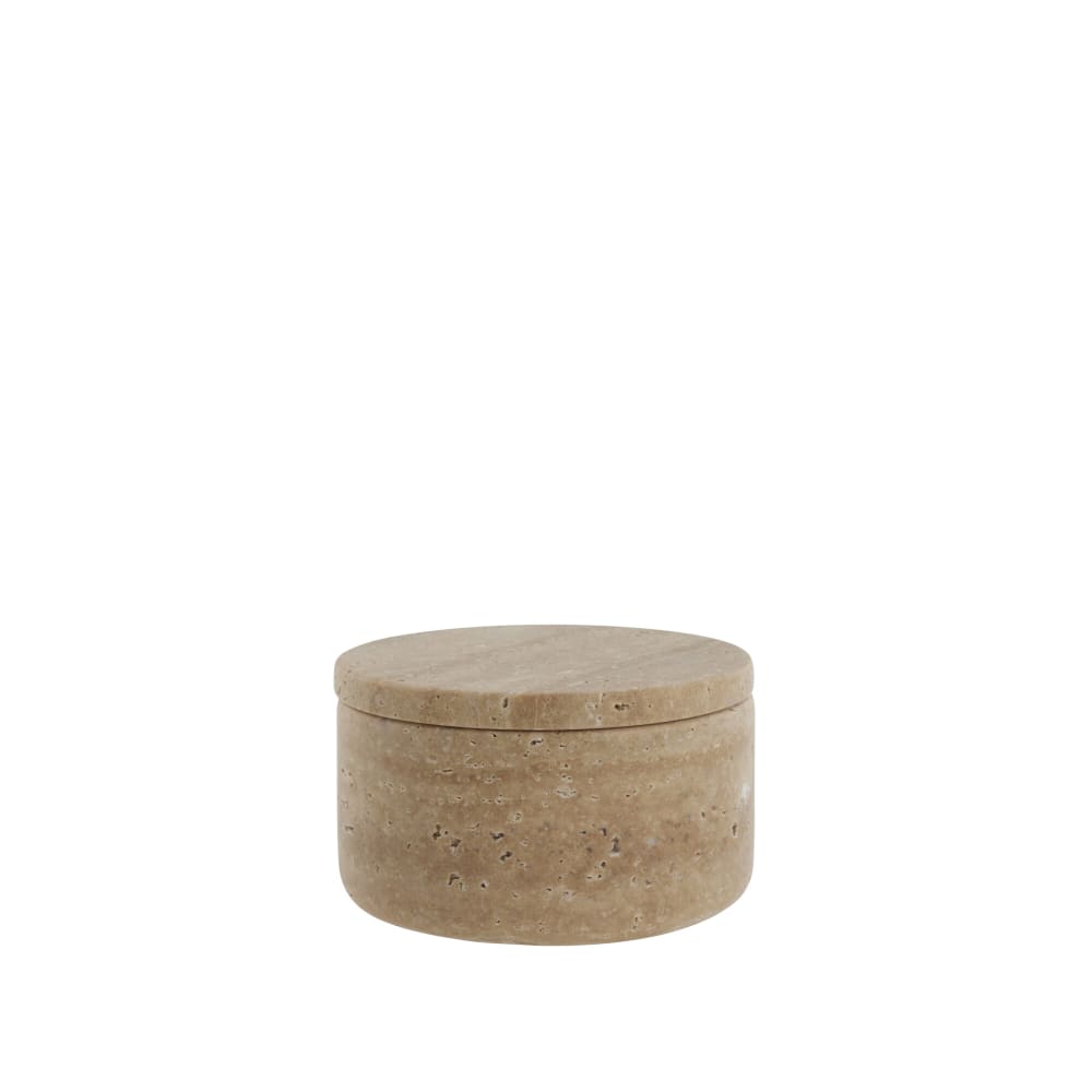 LENE BJERRE:s Travina burk i beige travertin är en exklusiv och lyxig detalj för ditt hem. Med modern design och tidlös textur skapar Travina en touch av lyx och skönhet i heminredningen. Perfekt för att vara rummets mittpunkt och en del av en fantastisk, modern stil. Så enkelt att matcha och skapa en djärv och distinkt atmosfär. Varje unik bit är handgjord och av marmor av hög kvalitet. Dimensioner: H: 6,5 cm, L: 10,5 cm, B: 10,5 cm. Skötselråd: Torka av med en mjuk trasa.
