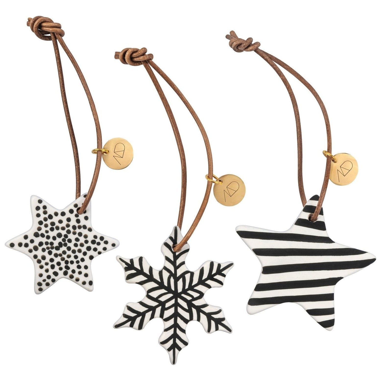 Liva upp julen med STAR Julgranshänge 3-pack i svart porslin från Mette Ditmer. Dessa handmålade och dekorativa ornament mäter 5-6 cm och kan användas på julgranen, i en vas eller som servettringar. Skapa en stämningsfull inredning med stil.