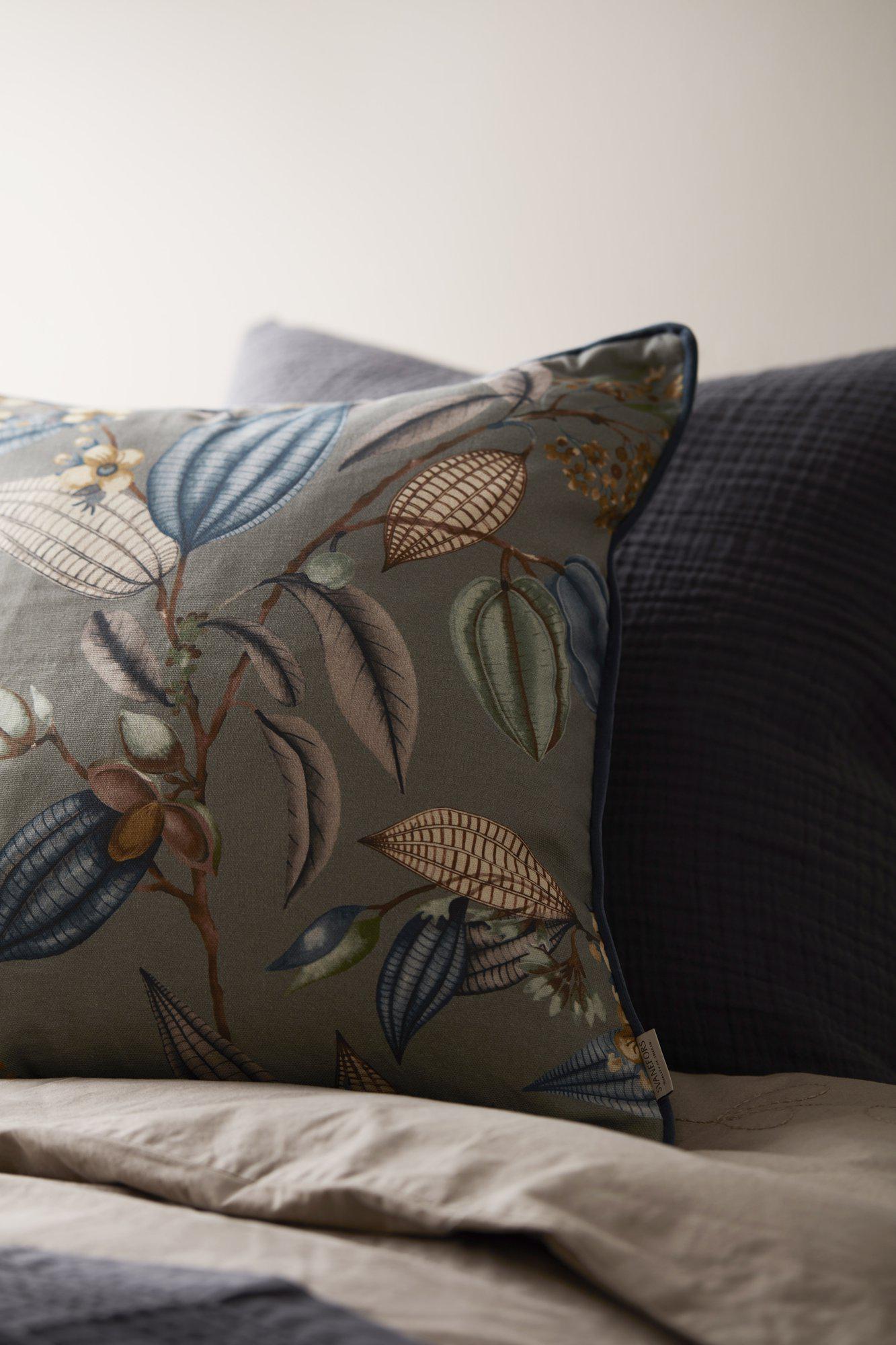 Kuddfodral med tryck mönster på bomullstyg och med matchande piping i sammet. Kuddfodralet har dragkedja i nederkant. Mått 45x45cm. Innerkudde köpes separat. För ett välfyllt utseende använd gärna en innerkudde som är något större, ca 50x50cm