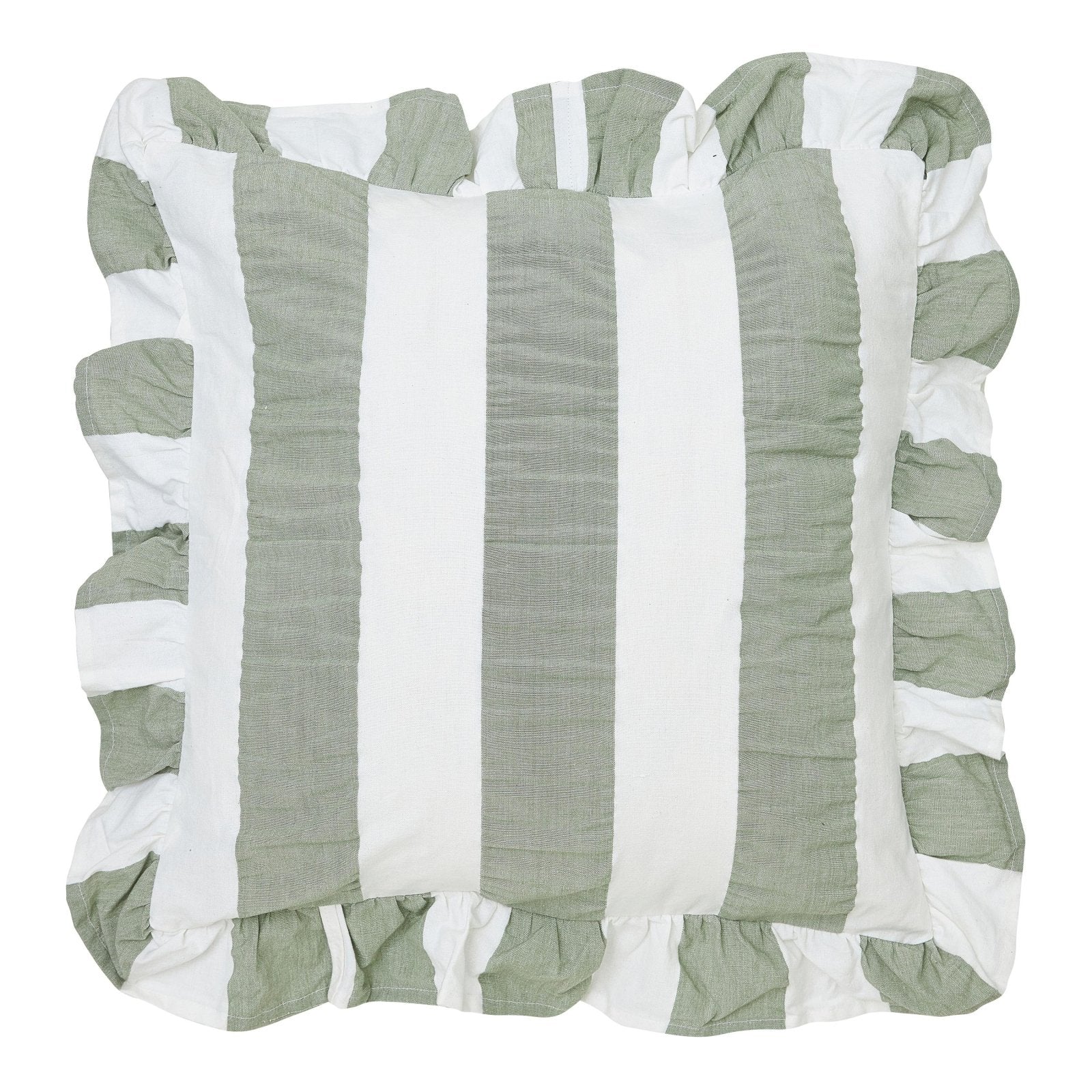 Ge ditt hem en touch av charm med vårt mjuka kuddfodral i grönvitt-randigt mönster och som har en bred volang som vackert ramar in kanterna. Detta kuddfodral har en subtilt krinklad effekt som bidrar till en elegant estetik. Skapa en snygg och avslappnad atmosfär i ditt rum med detta stilfulla och unika tillskott till din inredning. Låt kuddfodralet bli en smakfull detalj som lyfter fram ditt utrymme på ett enastående sätt och tar trendgraden till nästa nivå.