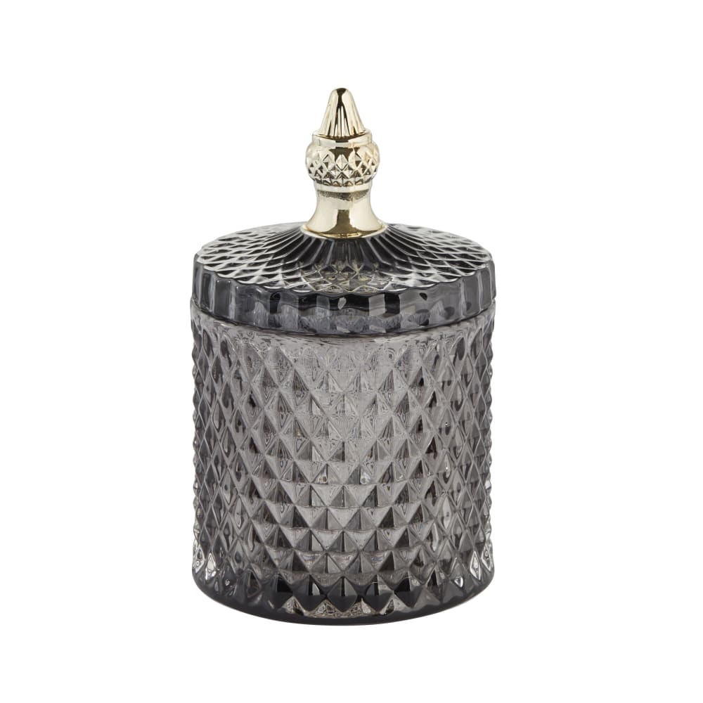 Miya Glasburk i mörkgrått och guld är en konstnärlig chic detalj för ditt hem. Förvara smycken eller små prydnader i denna elegant designade burk. Med sina vackra mönster passar den perfekt för att skapa personlig atmosfär i både badrummet och på din byrå. En mångsidig och stilfull inredningsdetalj från LENE BJERRE.