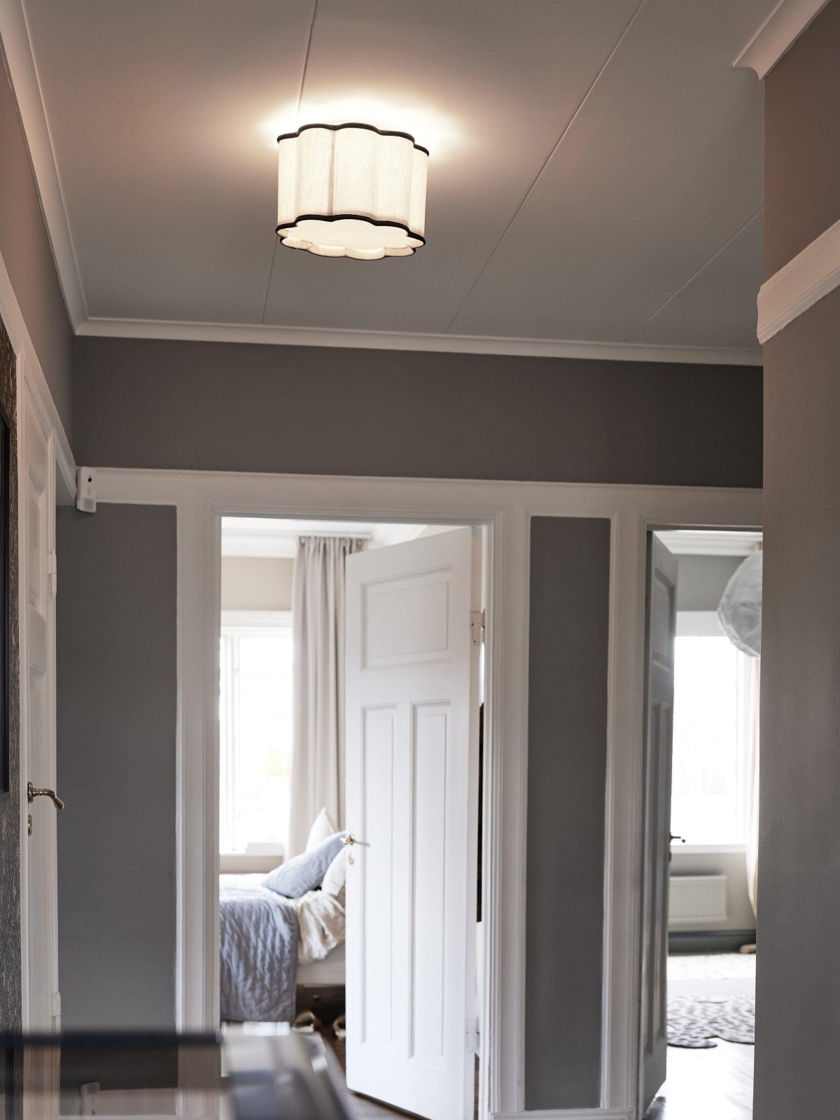 Plafond Judy. En blomformad plafond i ekologisk bomull med svarta kantband som framhäver formen och gör den till ett blickfång. Tyget är oblekt natur och är helfodrad i samma tyg. Formad bottenplatta i tyg. Denna plafond ger ett mjukt och behagligt allmänljus. Diameter 35cm, höjd 21cm. För krokupphäng.Taklampan kräver 3 stycken globformade glödlampor med E27 sockel, max 3x60W. LED ljuskällor rekommenderas. IP20. Ljuskällor och takkontakt ingår ej.