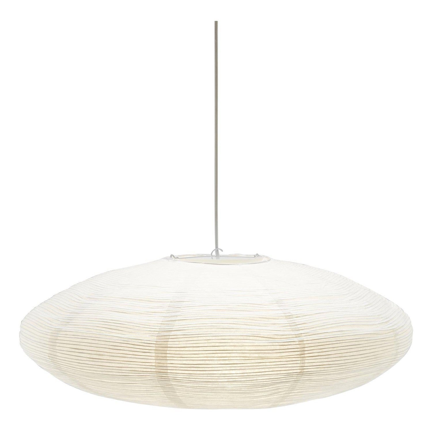Rispappersskärm Yuni med tät oregelbunden metalltråd som skapar ett vackert mönster. Yuni är ellips formad 58cm i diameter och höjd 23cm. Levereras utan lampsladd. Spänns ut till sin form med hjälp av en metallexpander som man även fäster lampsladden i.