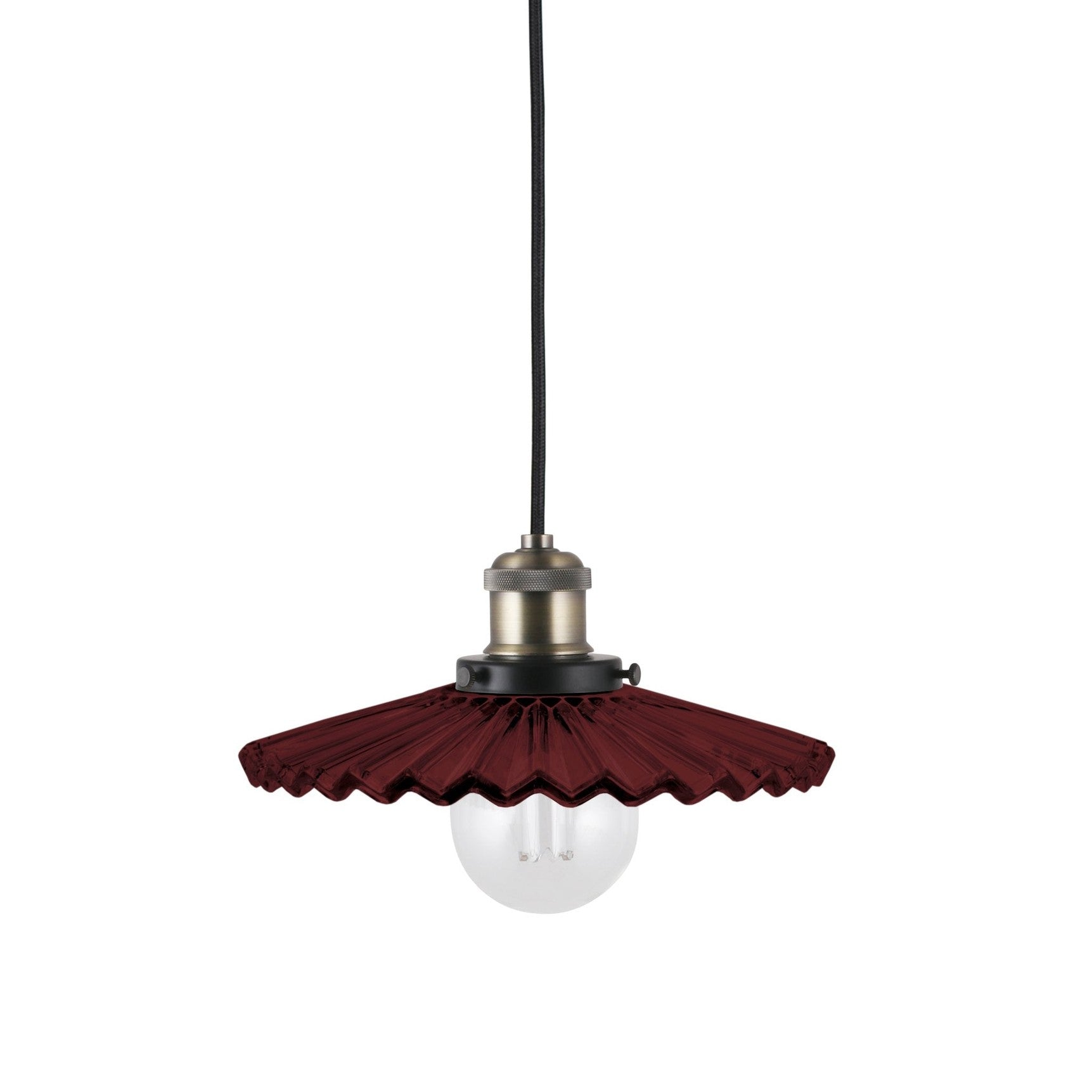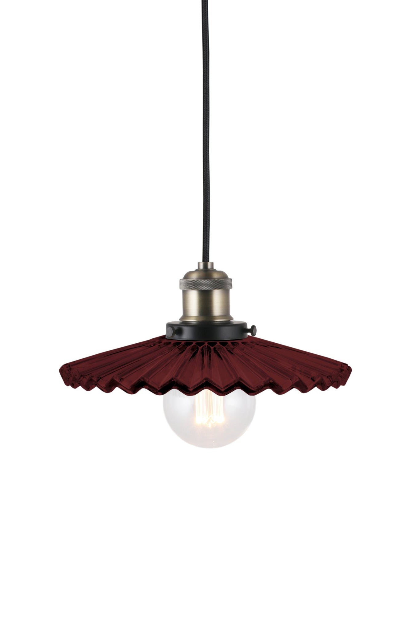 Cobbler återupplivar den klassiska skomakarlampans estetik med sin veckade glasskärm och detaljer i svart och antikmässing. Den 120 cm långa svarta textilkabeln och den svarta plasttakkoppen kompletterar dess traditionella charm. Kronkoppling för takanslutning medföljer ej.