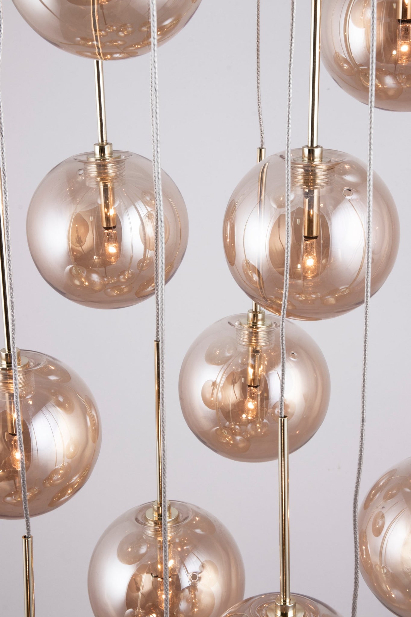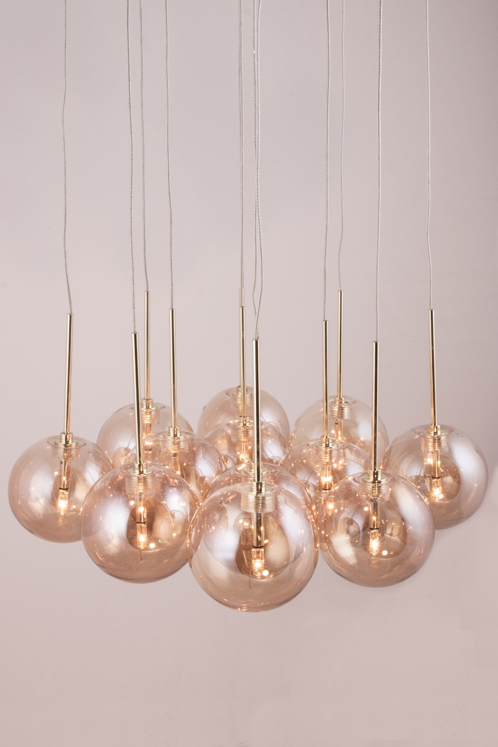 Lampans takplatta i mässingfärgad metall monteras med krokupphäng mot taket och har 12 vajrar med amberfärgade glaskupor. Minsta totalhöjd 33 cm och högsta totalhöjd 213 cm för att skapa ett intressant mönster med glaskuporna. 12 st LED-ljuskällor medföljer denna armatur. Armaturen är endast dimmerkompatibel med LED-ljuskällor.