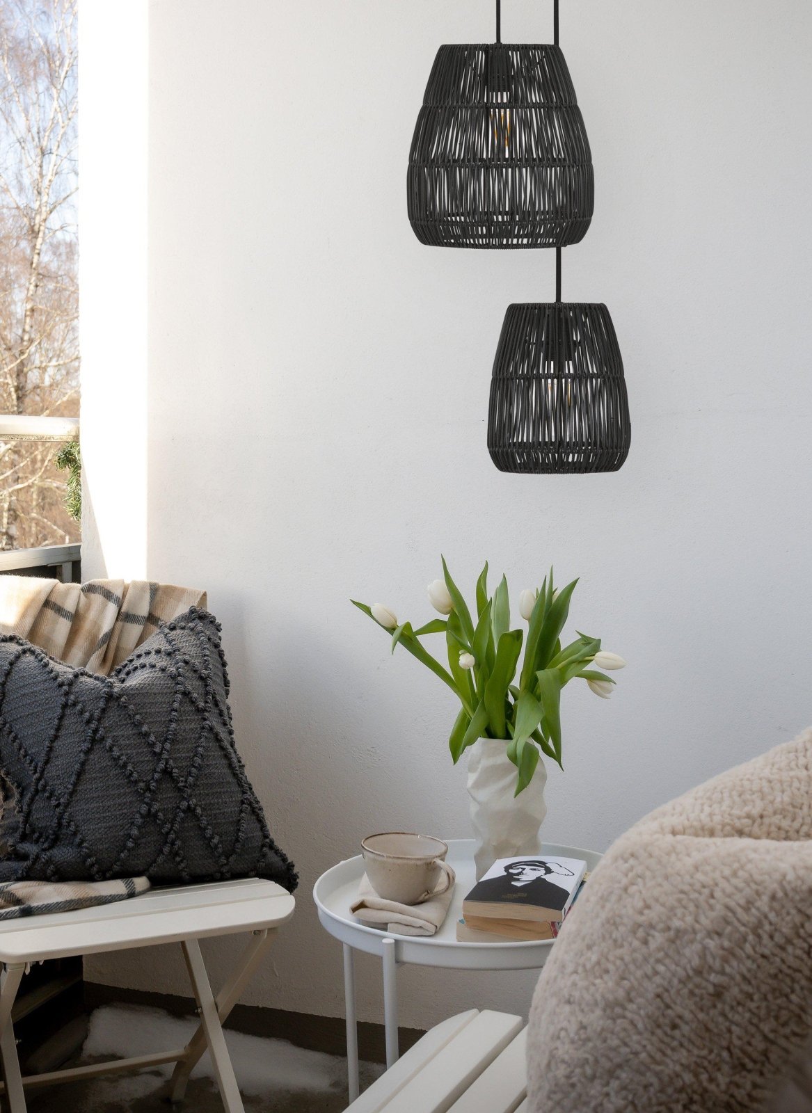 Saigon, en utomhusskärm i konstrotting. Konstrotting är ett tåligt material som klarar väder och vind. Den flätade strukturen skapar ett vackert ljusspel. Sladdställ för utomhusbruk köpes separat. Höjd 20cm, bredd 18cm och djup 18cm.