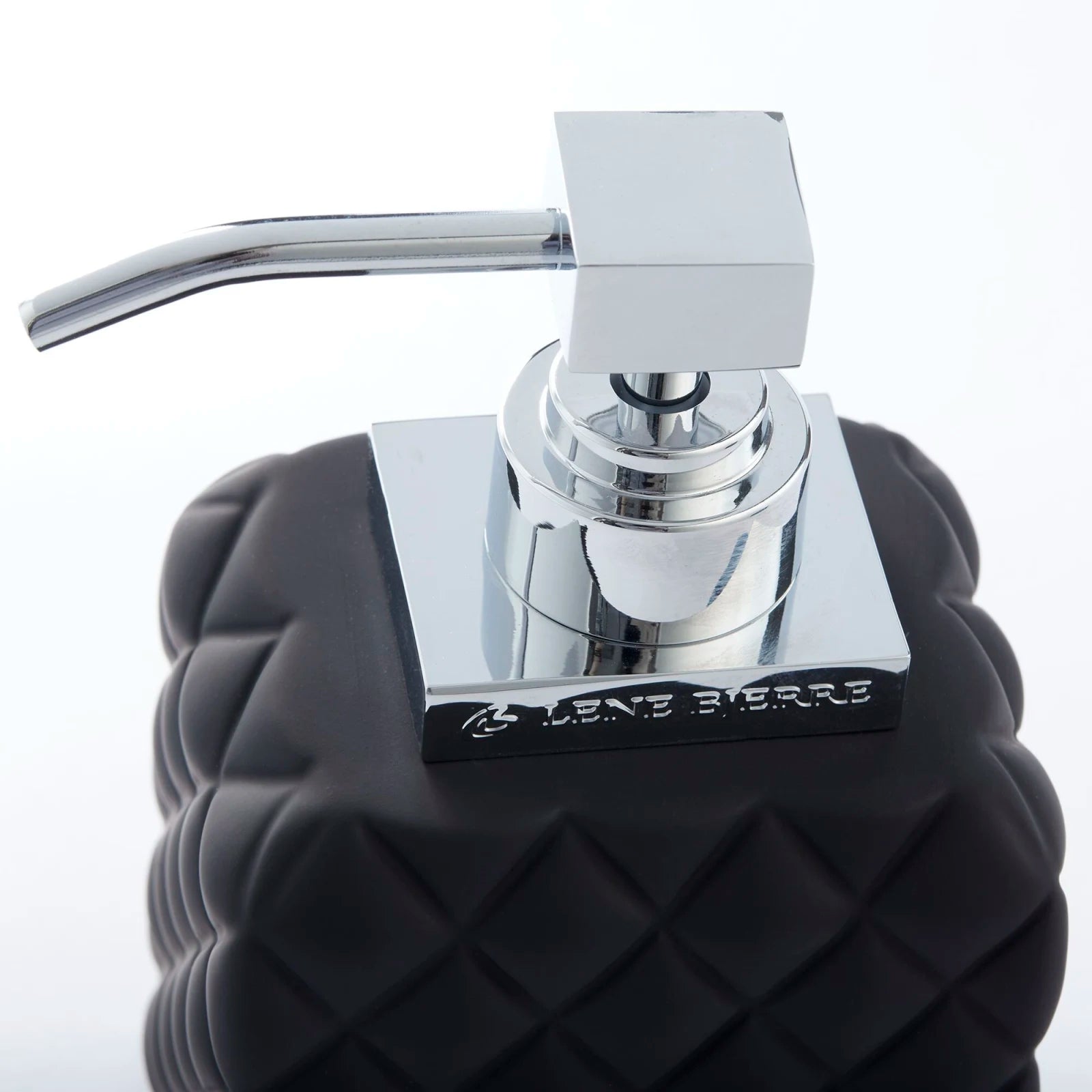 Få en elegant touch med Portia Tvålpump H16 i svart och silver från LENE BJERRE. Den vackra tvålpumpen har en unik harlequin-design och mäter L9xB7xH16 cm. Ett praktiskt och dekorativt inslag i badrummet som passar perfekt för en modern inredningsstil och ger en exklusiv känsla. Perfekt för att hålla badrummet organiserat och stilrent.