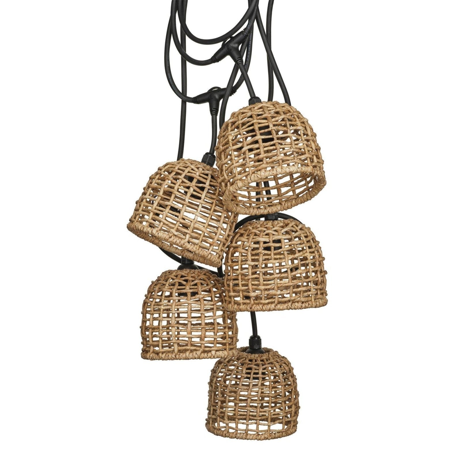 Flex Out ljussinga för utomhusbruk (IP44) med 5 st lamphållare. Total längd 6,5 m, 2,5 m till första lamphållaren, sedan 80 cm mellan varje lamphållare. 15 cm från T-koppling ner till skärmring. Här matchat med 5 st Cebu lampskärm i naturmaterial. Skärmen är 17 cm bred och 16 cm hög.