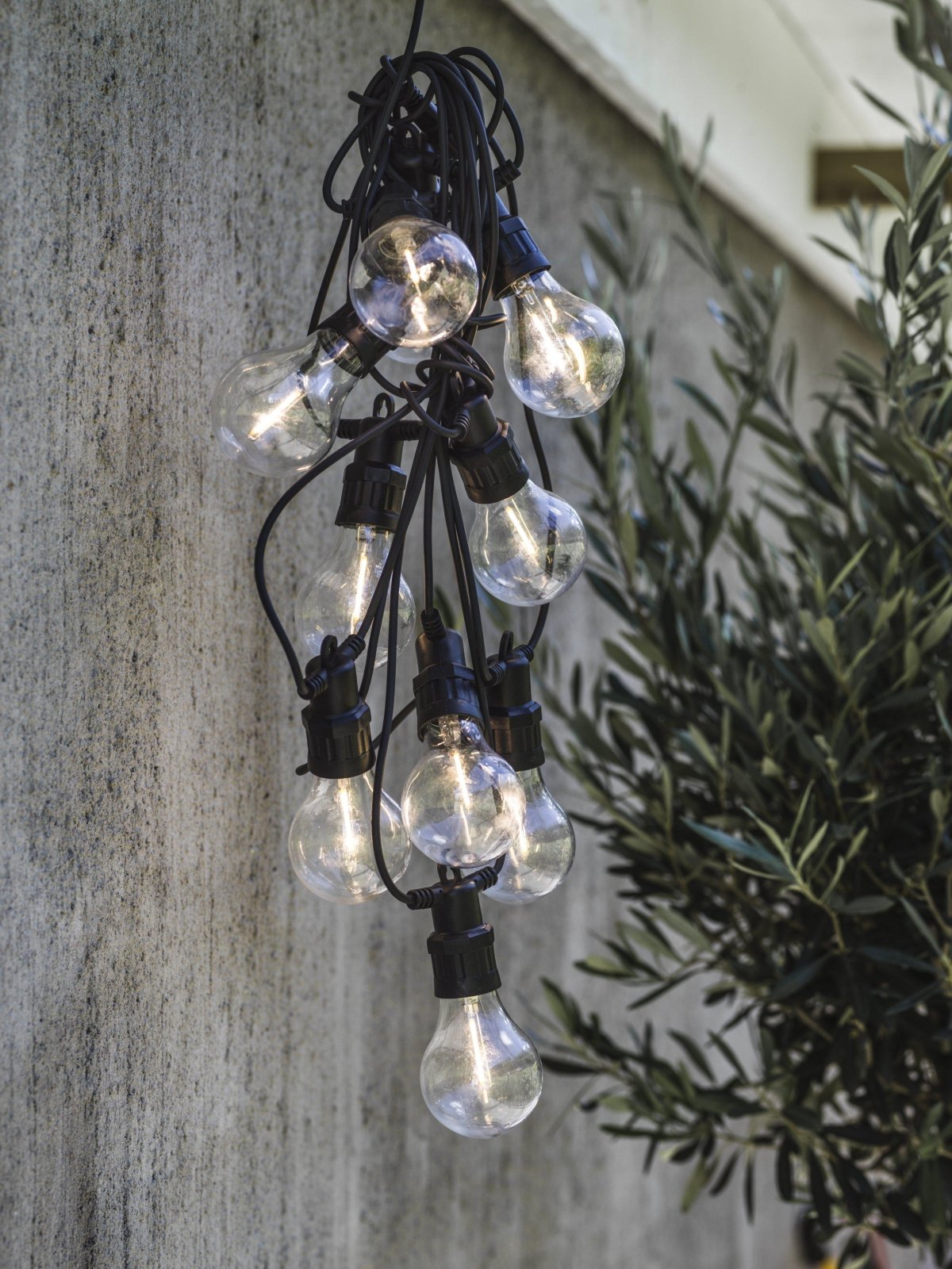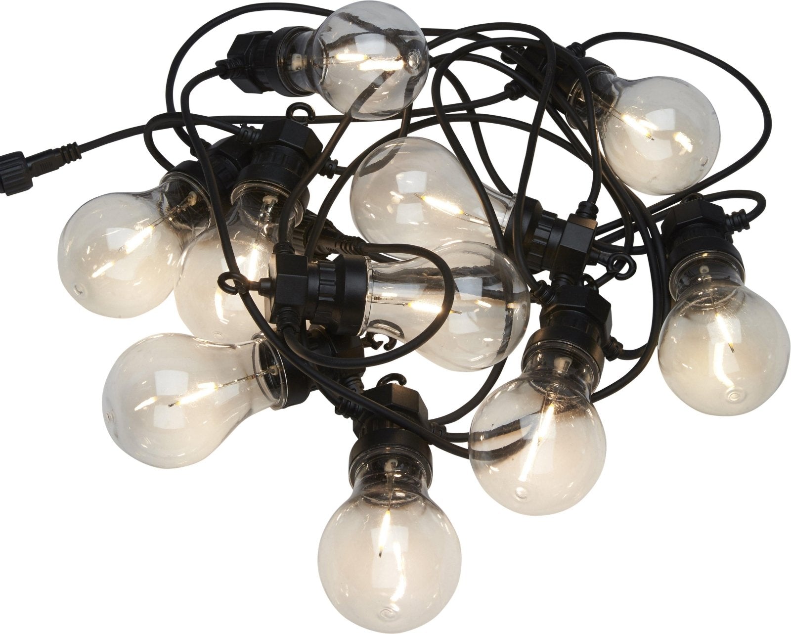 Glow ljusslinga, skapa stämning inomhus, på din uteplats eller balkong. Svart ljusslinga med 10st, fasta ej utbytbara, lampor i klart plastglas (PET). Lamporna ger ett varmvitt sken, 2700K. 40 lumen. Lamphållarna har en liten krok längst upp som du kan använda till att hänga upp i tex en lina. Ljusslingan är 8,7m lång och det är 4m till första lampan, därefter 0,5m mellan varje samt en liten kort svans vid sista lampan. IP44 för inom- eller utomhusbruk. Denna lågvoltsslinga har en rund tunnare kabel och transformator. Totala längden är 8,7m. Går ej att bygga på fler slingor.
