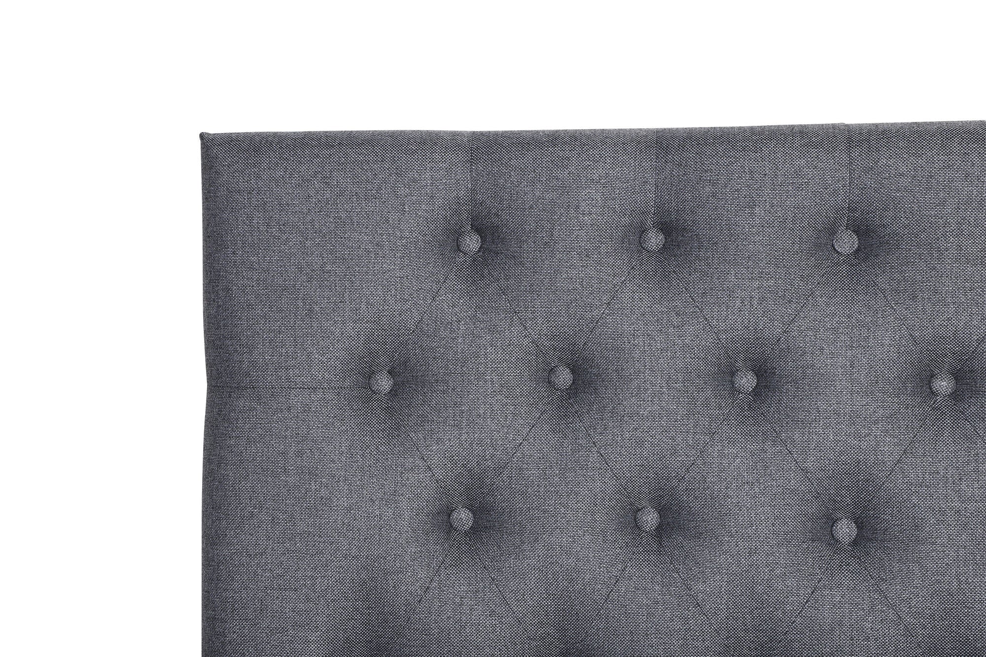 Furuvik, Fristående lyxig sänggavel i helklädd design i ett mörkgrått polyestertyg med dekorsömmar och djuphäftade klädda mörkgrå knappar. Med denna sänggavel är det enkelt att skapa en lyxig känsla till ditt sovrum. Mått: Bredd: 120 cm, Höjd: 125 cm, Djup: 10 cm. Material: ram byggd i trä och kallskum, klädd i polyestertyg. Tips/råd: Ställ gaveln mellan väggen och sängenså behövs ingen förankring. Njut av skön sömn - i ditt pampiga sovrum!