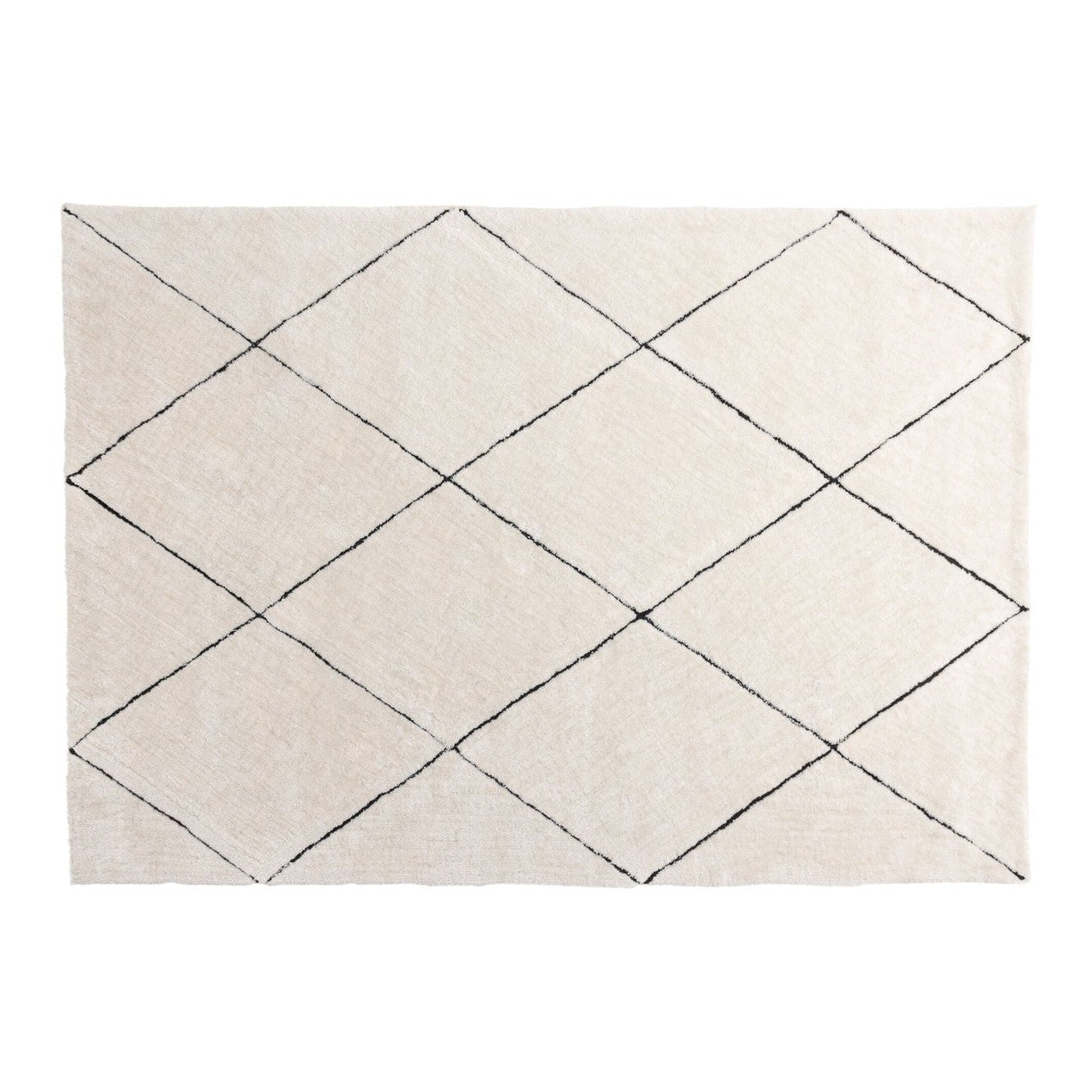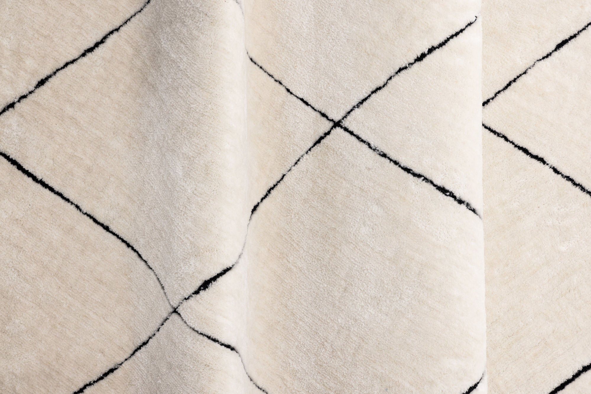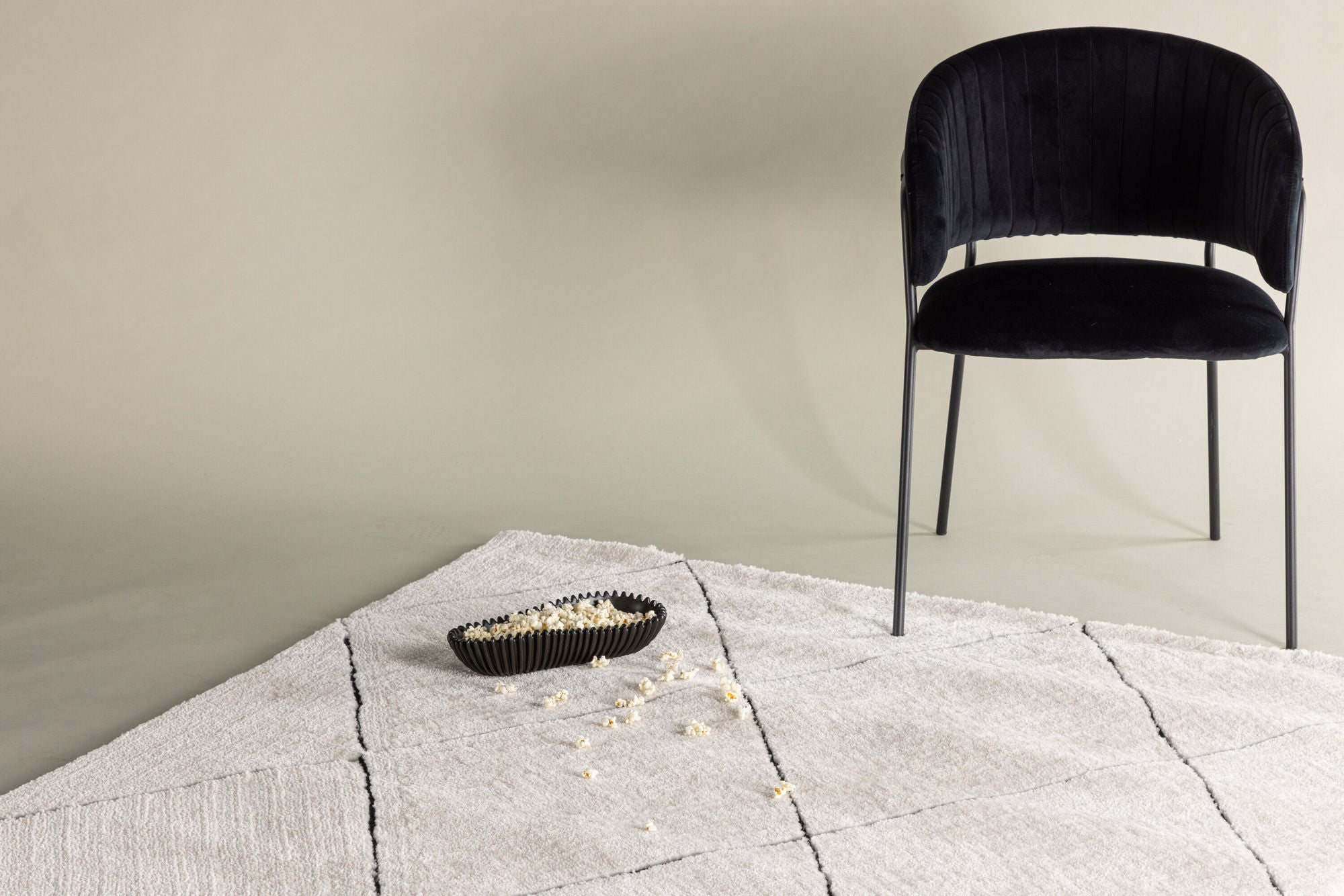 Med sin vit basfärg ger denna matta en känsla av lugn och renhet. Den vita färgen fungerar som en neutral bas som smälter in i olika inredningsstilar, skapar en känsla av rymlighet och ljus i rummet samtidigt som den läckra textur-detaljerna skapar dimension och intresse. Det svarta dekorativa rutmönstren ger liv och rörelse till mattan och skapar visuell kontrast i designen.