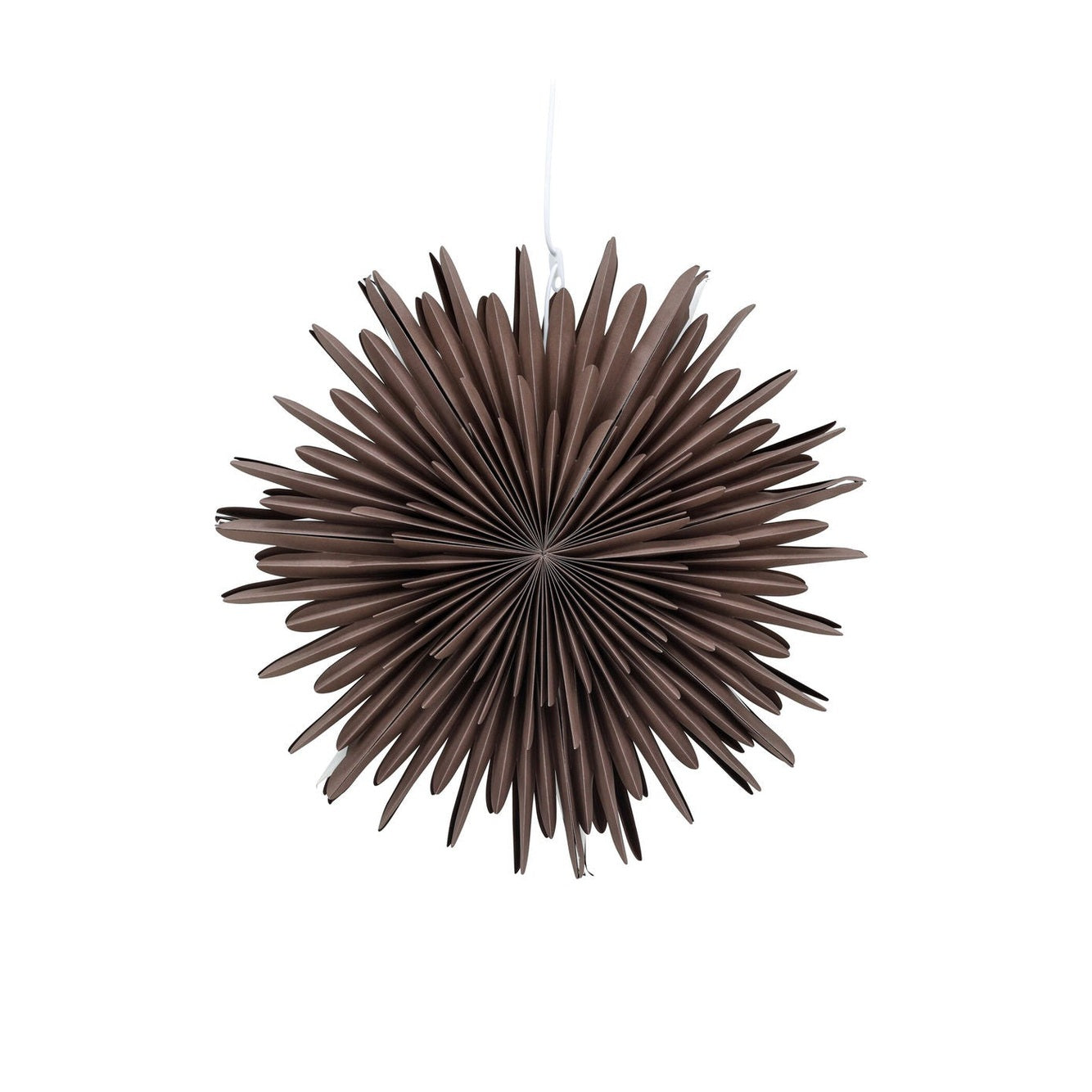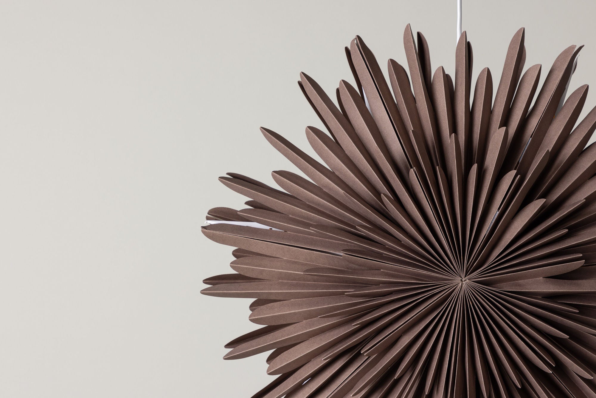 Inred ditt hem med varmt ljus under kalla vinterdagar med hjälp av vår pappersstjärna i greige färg från serien Sälen! Den här taklampan är formad som en blommande stjärna som sprider ett magiskt sken och mysiga känslor när det behövs som mest. Kulören drar mot den mörkbruna färgen men har även toner av lite grått och beige i sig.